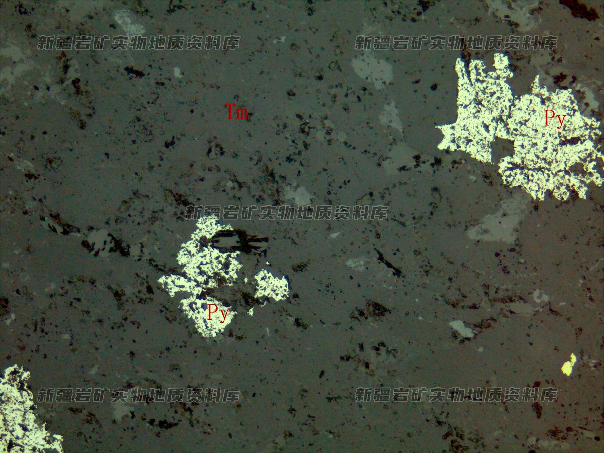 岩石特征描述: 金属硫化物为黄铁矿(Py),半自形-他形粒状,分布在透明矿物(Tm)粒间