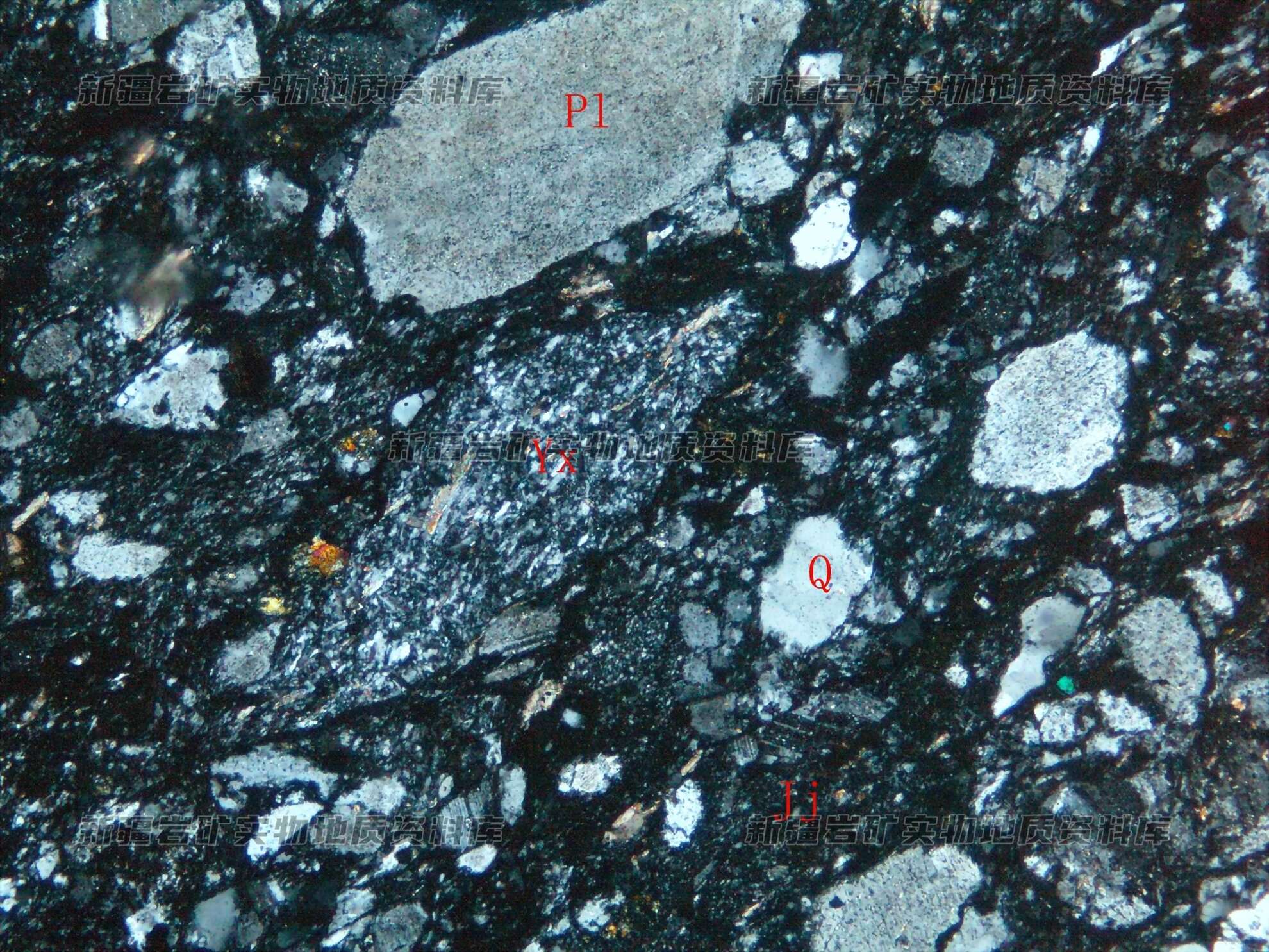 岩石特征描述: 岩石主要由长石(Fb)、石英(Q)碎屑、岩屑(Yx)及胶结物(Jj)构成