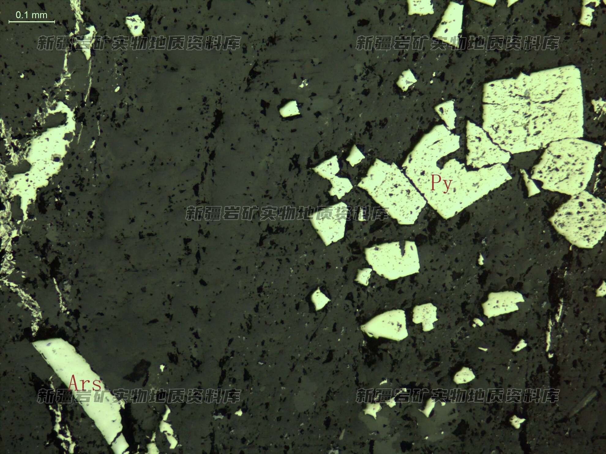 岩石特征描述: 金属矿物主要为黄铁矿(Py),次有少量毒砂(Ars)自形-半自形粒状,少量呈脉状分布。