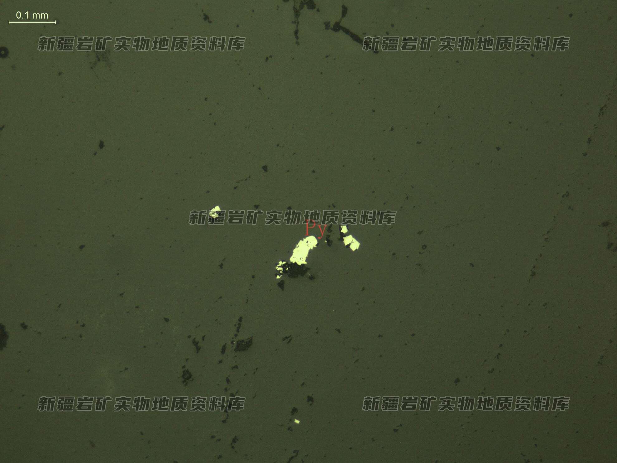 岩石特征描述: 光片中金属矿物很少见,仅有微量的黄铁矿(Py),他形-半自形粒状分布在脉石矿物之间。