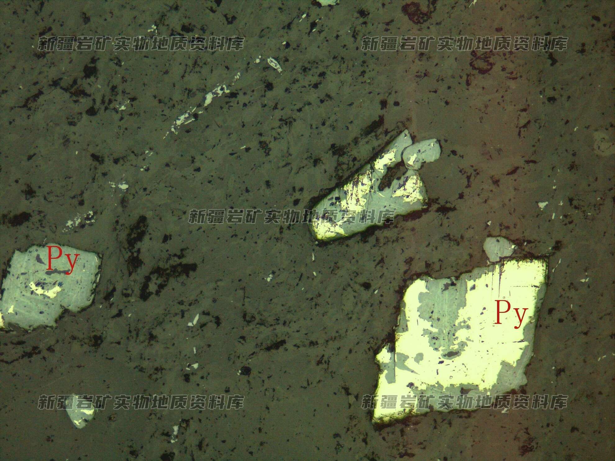 岩石特征描述: 金属硫化物为黄铁矿(Py),半自形粒状,被褐铁矿沿边缘交代呈残余存在。
