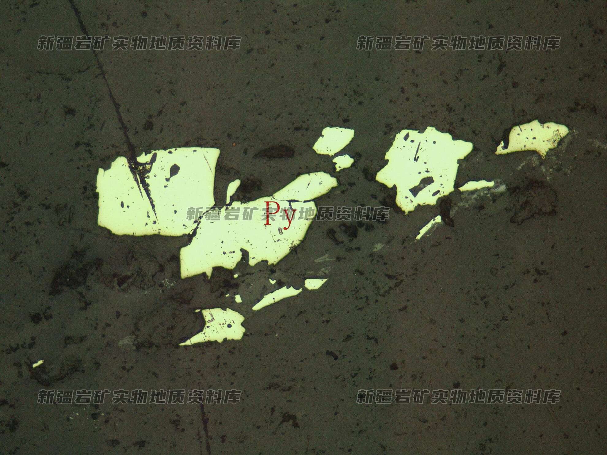 岩石特征描述: 金属硫化物为黄铁矿(Py),他形-半自形粒状,呈聚粒状定向分布。