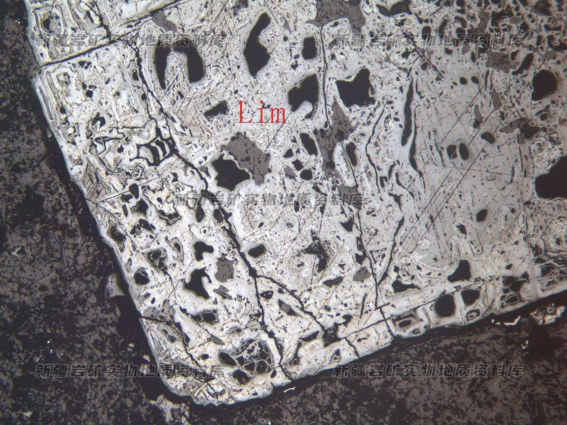 岩石特征描述: 粗粒的金属硫化物黄铁矿被次生矿物褐铁矿(Lim)取代,并保留了黄铁矿的假象。