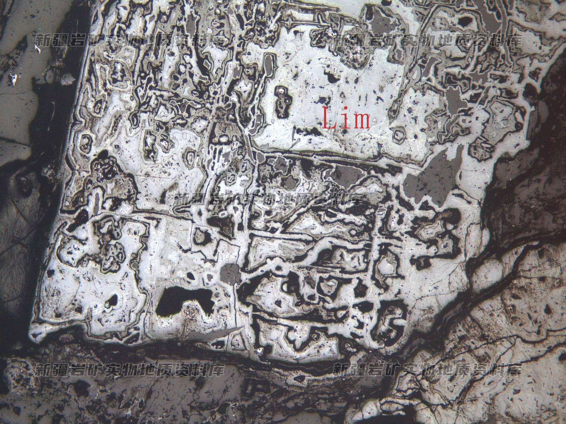 岩石特征描述: 粗粒的金属硫化物黄铁矿被次生矿物褐铁矿(Lim)取代,并保留了黄铁矿的假象。