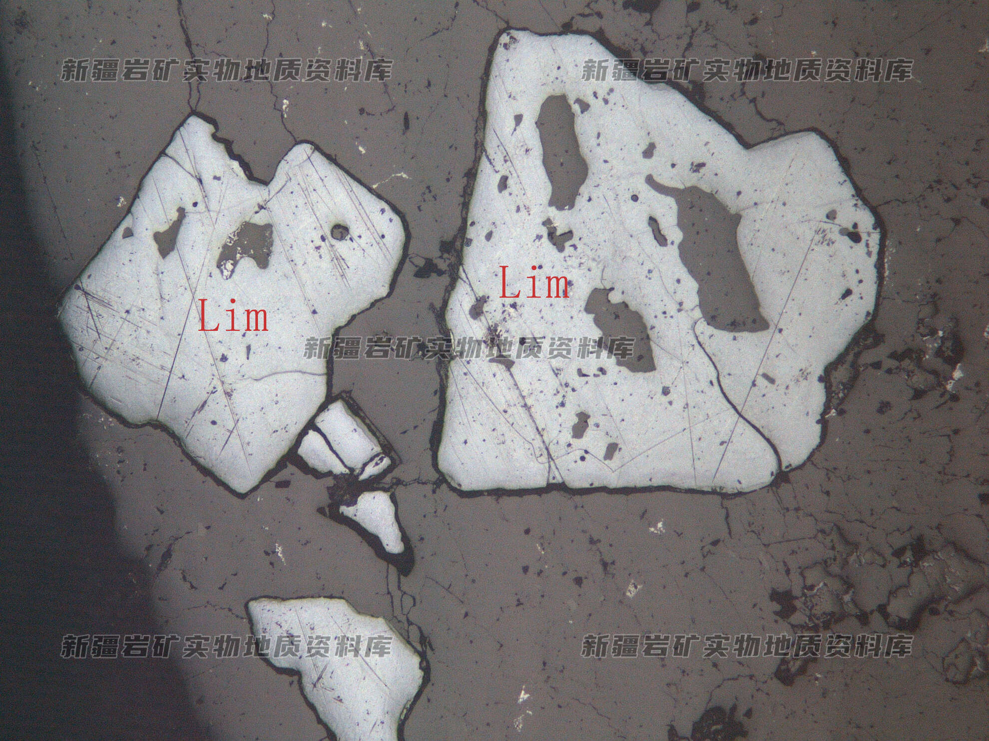 岩石特征描述: 金属硫化物黄铁矿被次生矿物褐铁矿(Lim)取代,并保留了黄铁矿的假象。