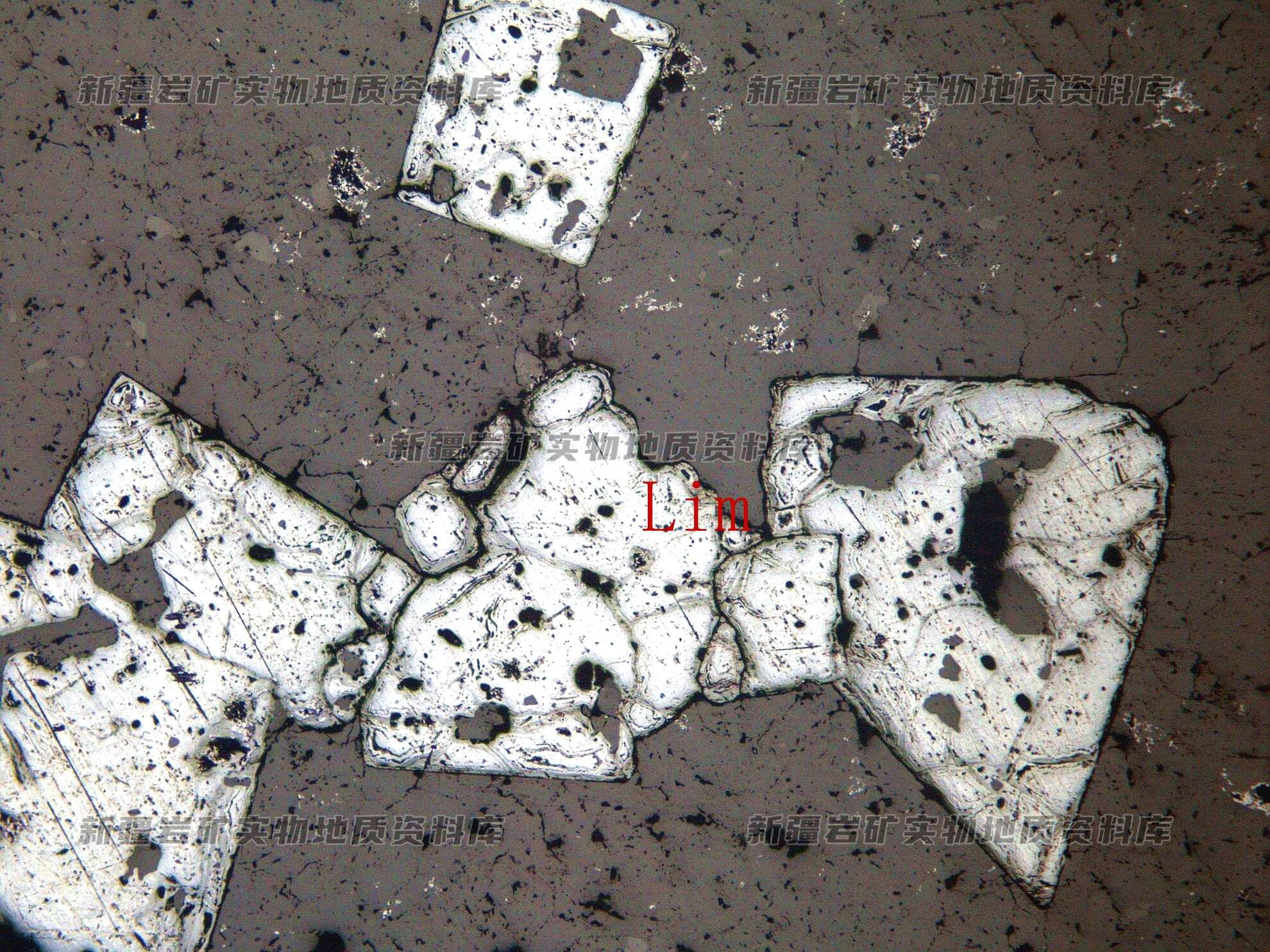 岩石特征描述: 金属硫化物黄铁矿被次生矿物褐铁矿(Lim)取代,并保留了黄铁矿的假象。
