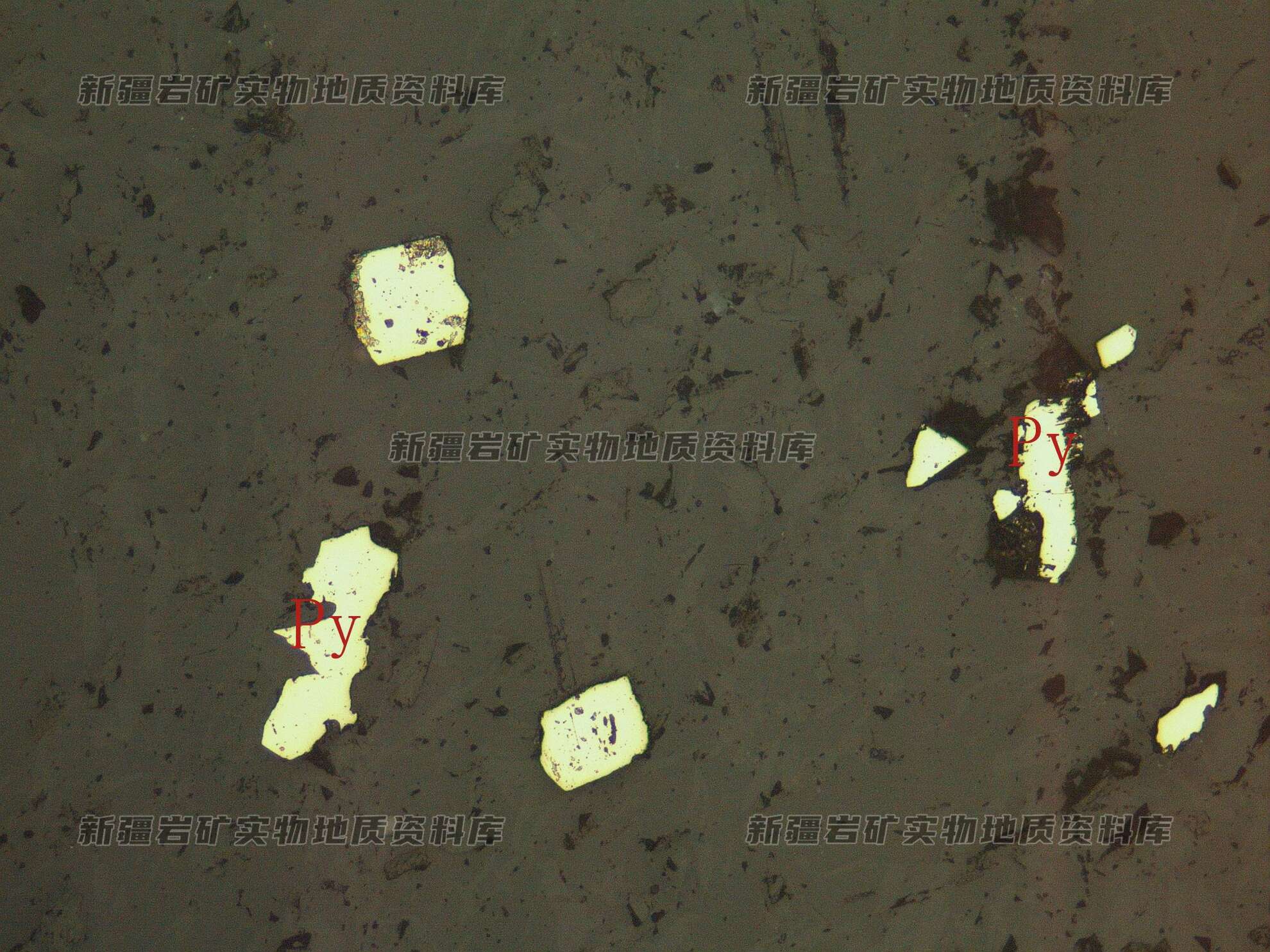 岩石特征描述: 金属硫化物黄铁矿(Py)少见,自形-半自形粒状,呈星点浸染状产出。