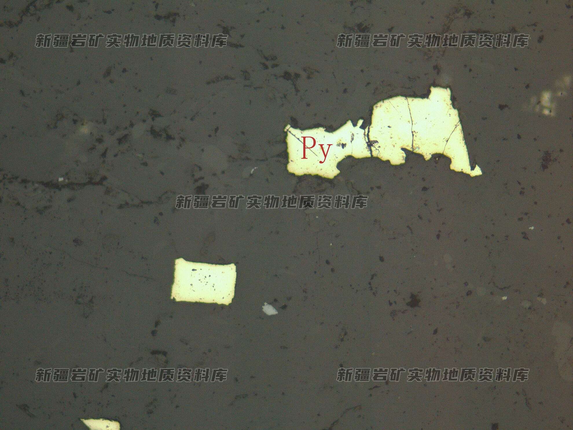 岩石特征描述: 金属硫化物黄铁矿(Py),自形-半自形粒状,呈星点浸染状产出。