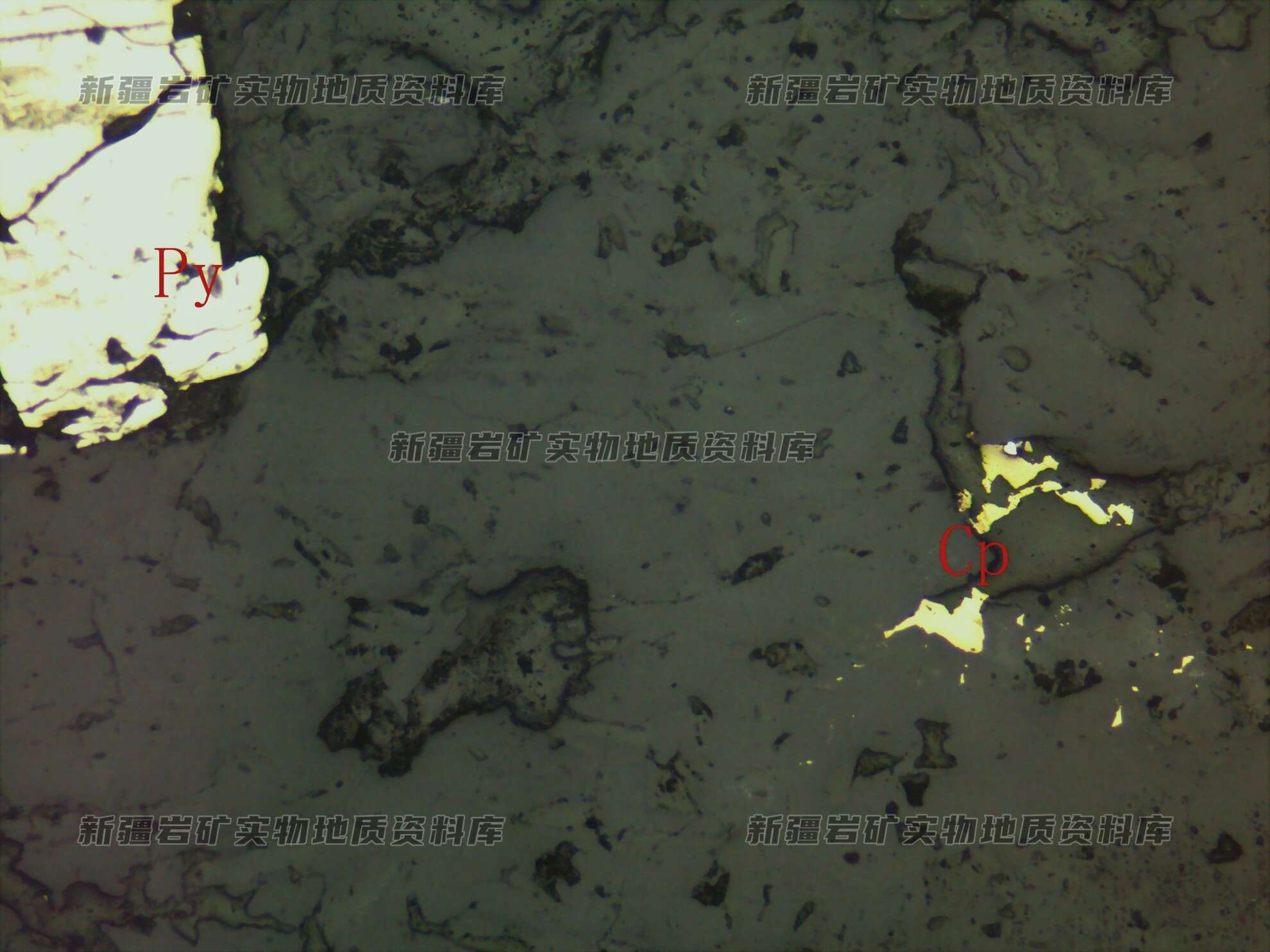 岩石特征描述: 金属硫化物黄铁矿(Py)和黄铜矿(Cp)他形-半自形粒状,呈星点浸染状产出。