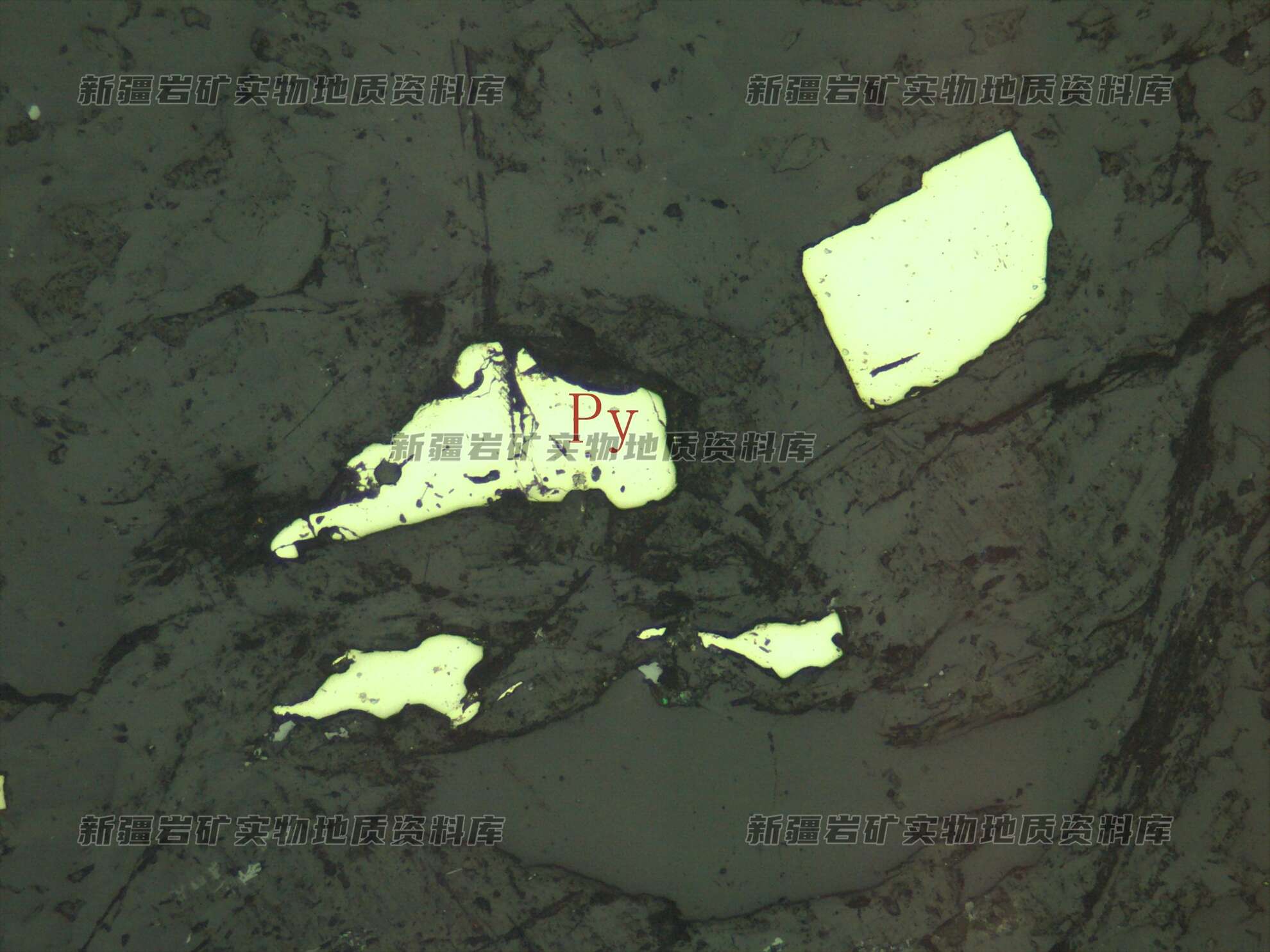 岩石特征描述: 金属硫化物黄铁矿(Py)他形-半自形粒状,呈星点浸染状产出。