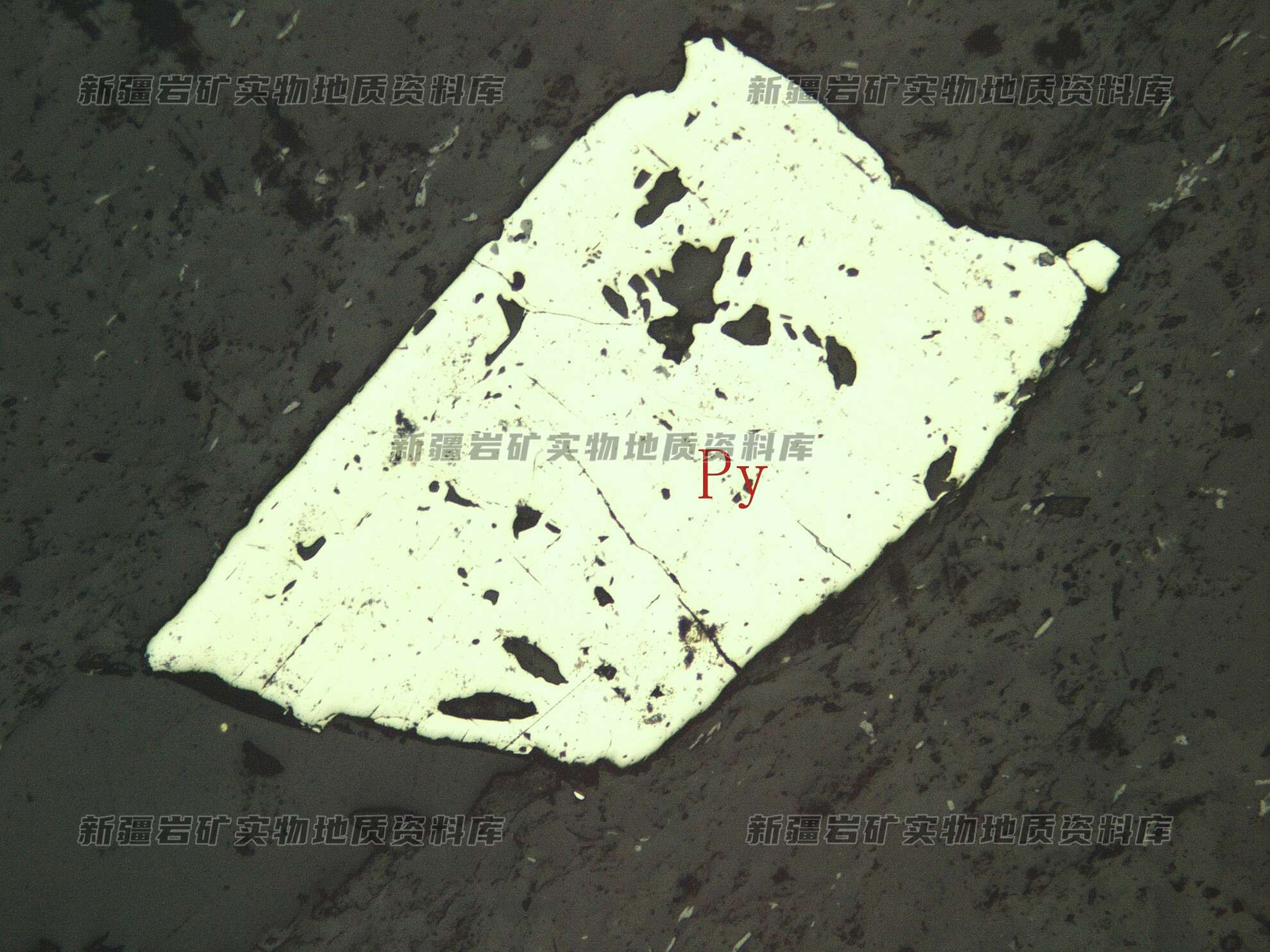 岩石特征描述: 黄铁矿(Py)半自形粒状,分布在透明矿物之间。