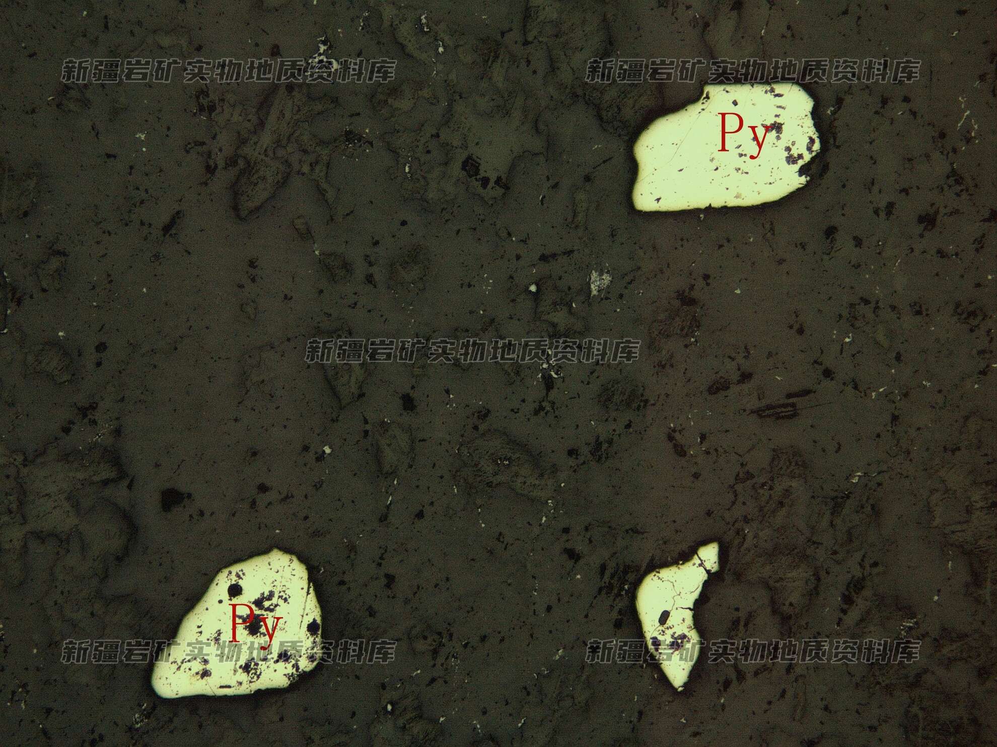岩石特征描述: 黄铁矿(Py)半自形粒状,呈星点浸染状分布在透明矿物之间。