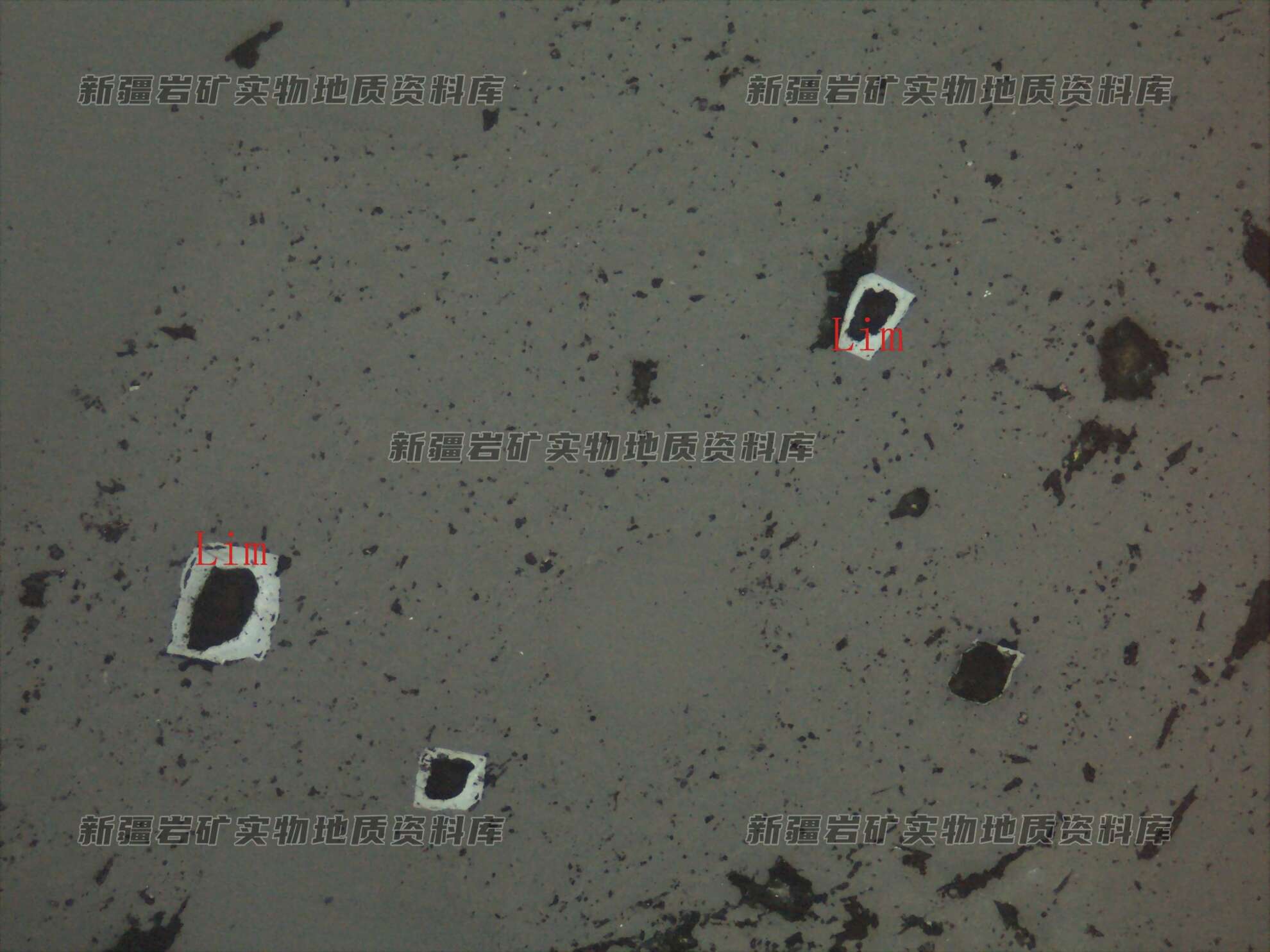 岩石特征描述: 黄铁矿自形粒状,被次生褐铁矿(Lim)取代,仍保留了黄铁矿的外形,呈星点浸染状分布。