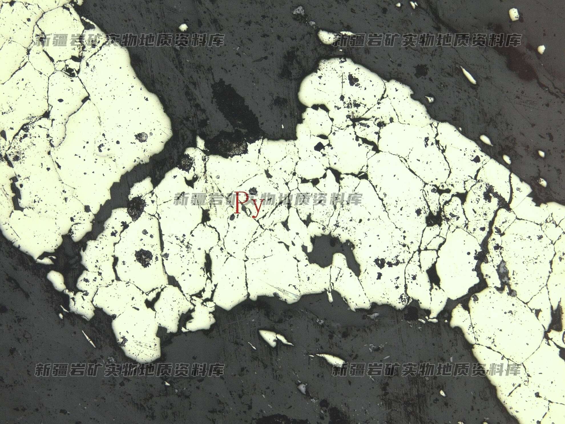 岩石特征描述: 黄铁矿(Py)半自形粒状集合体,呈脉状产出。