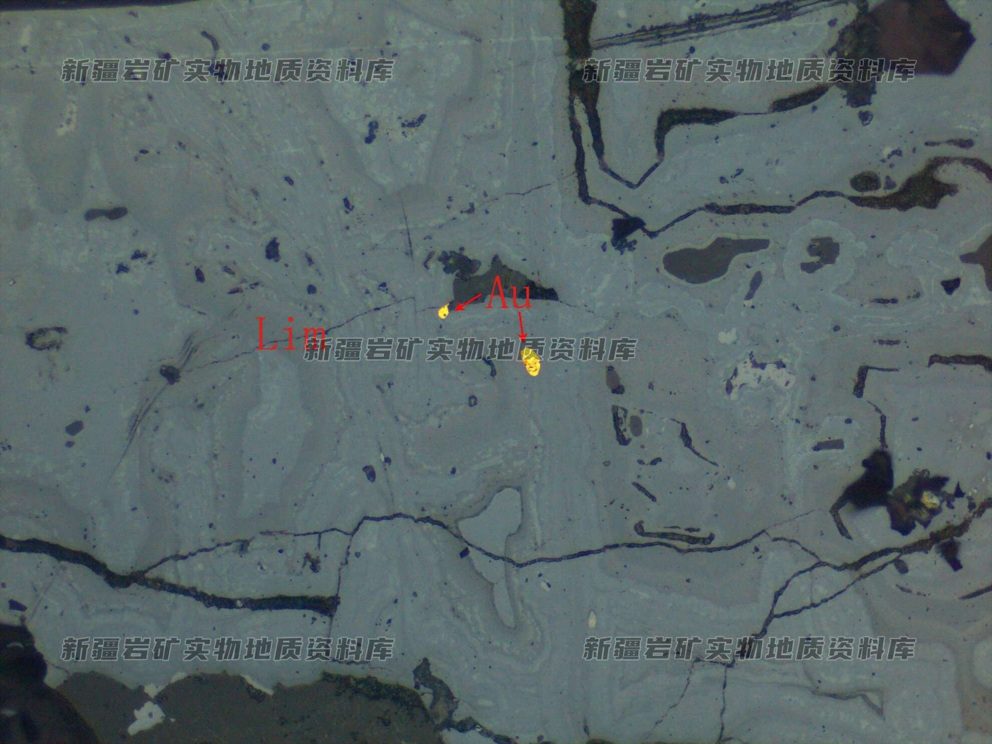 自然金(Au)他形粒状,粒径很细,包裹在已褐铁矿(Lim)化的黄铁矿中。