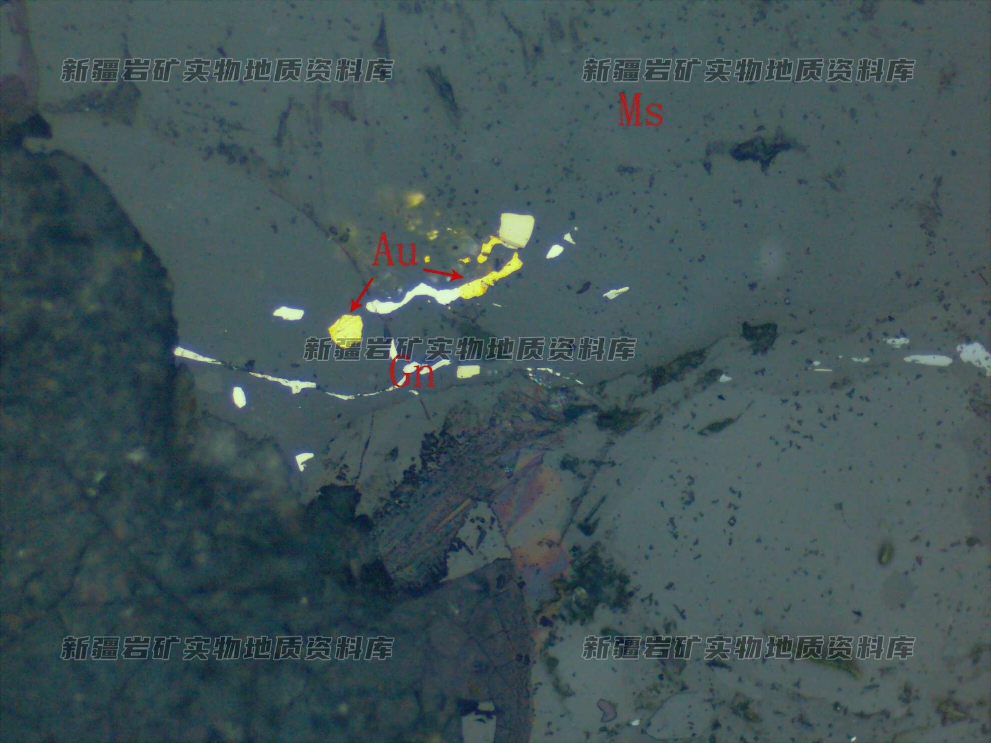 自然金(Au)他形粒状,粒径很细,包裹在已脉石矿物(Ms)中或在其微裂隙中,与其共生的是方铅矿(Gn)。