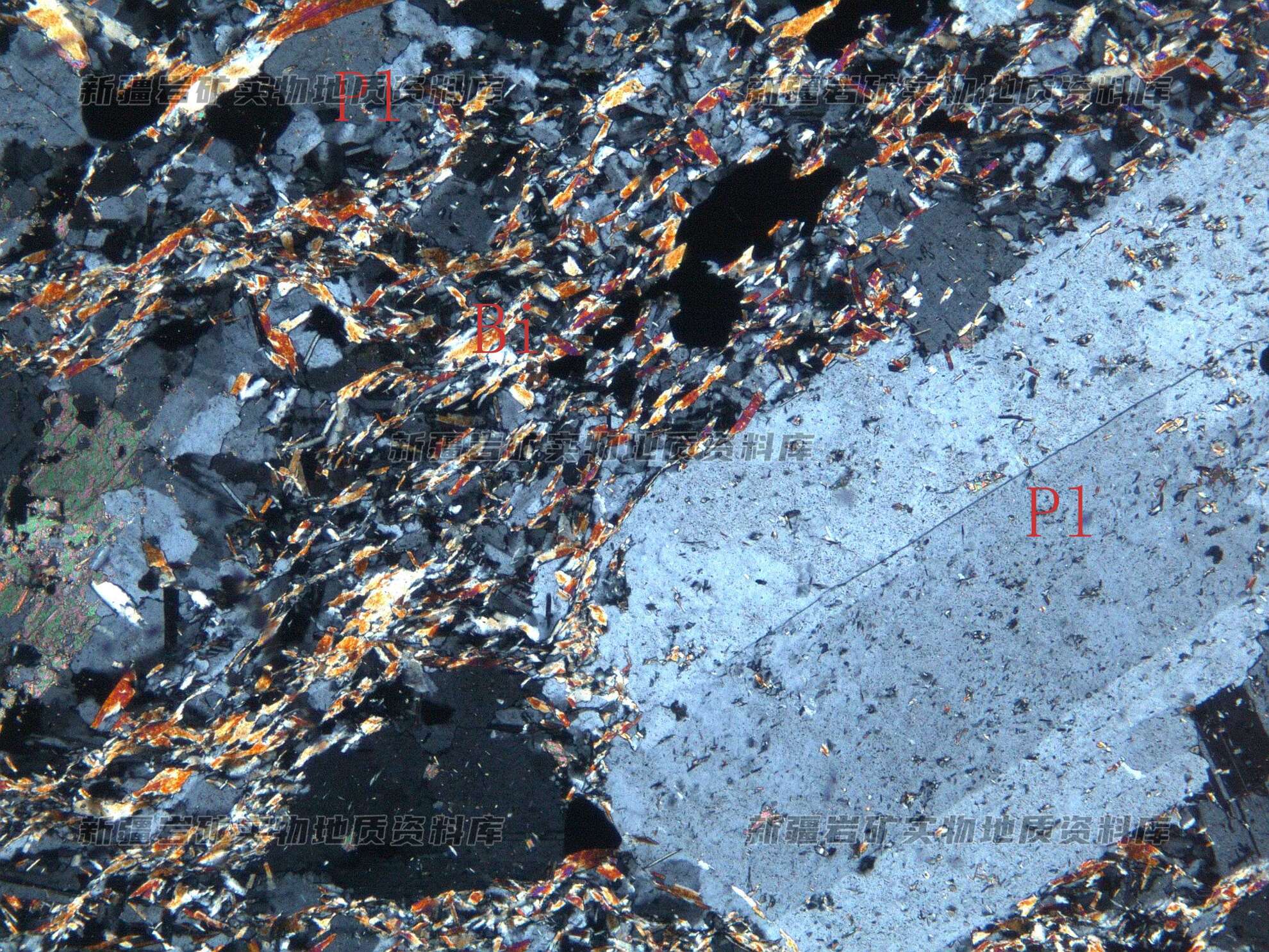 岩石特征描述: 岩石具斑状结构,斑晶为斜长石(Pl),呈半自形板状分布。基质由细粒斜长石和云母(Bi)等构成。
