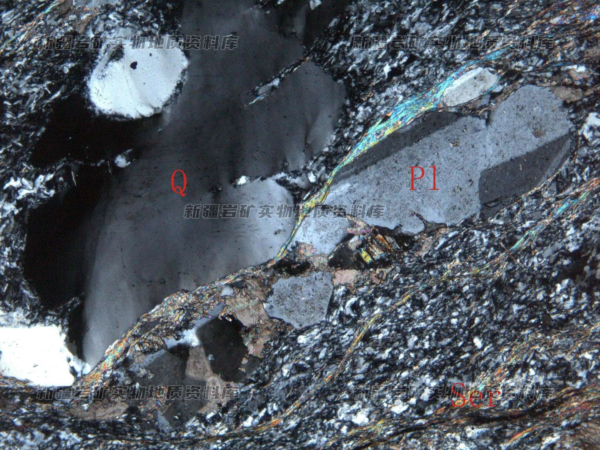 岩石特征描述: 岩石具斑状结构,斑晶为斜长石(Pl)和石英(Q),受应力作用影响,具碎裂及变形现象。基质由细粒的长石、石英及次生绢云母(Ser)、方解石等构成。