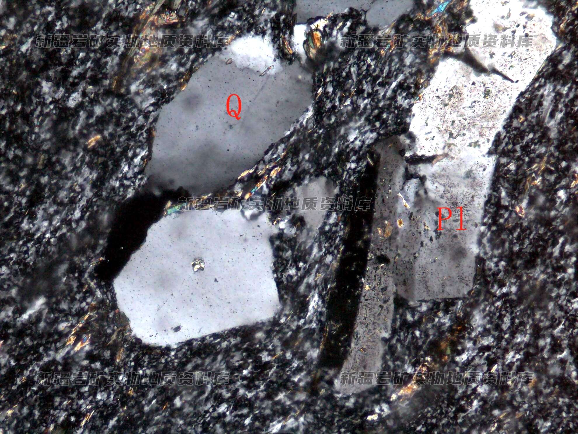 岩石特征描述: 岩石具斑状结构,斑晶为斜长石(Pl)和石英(Q),受应力作用影响,长石具碎裂及变形现象。基质由细粒的长石、石英及次生绢云母等构成。