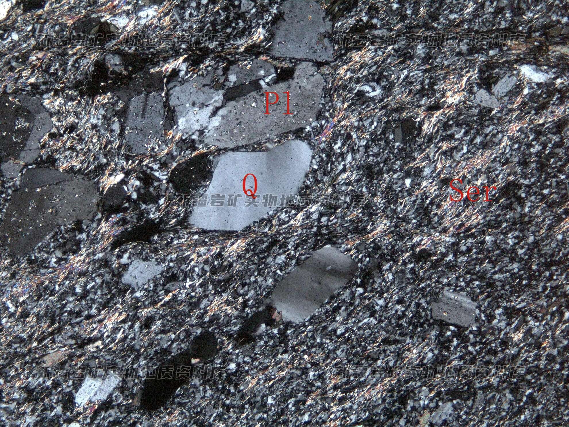 岩石特征描述: 岩石具斑状结构,斑晶为斜长石(Pl)和石英(Q),受应力作用影响,斑晶被压碎及变形。石英内部波状消光明显,基质由细粒的长石、石英及次生绢云母(Ser)等构成。