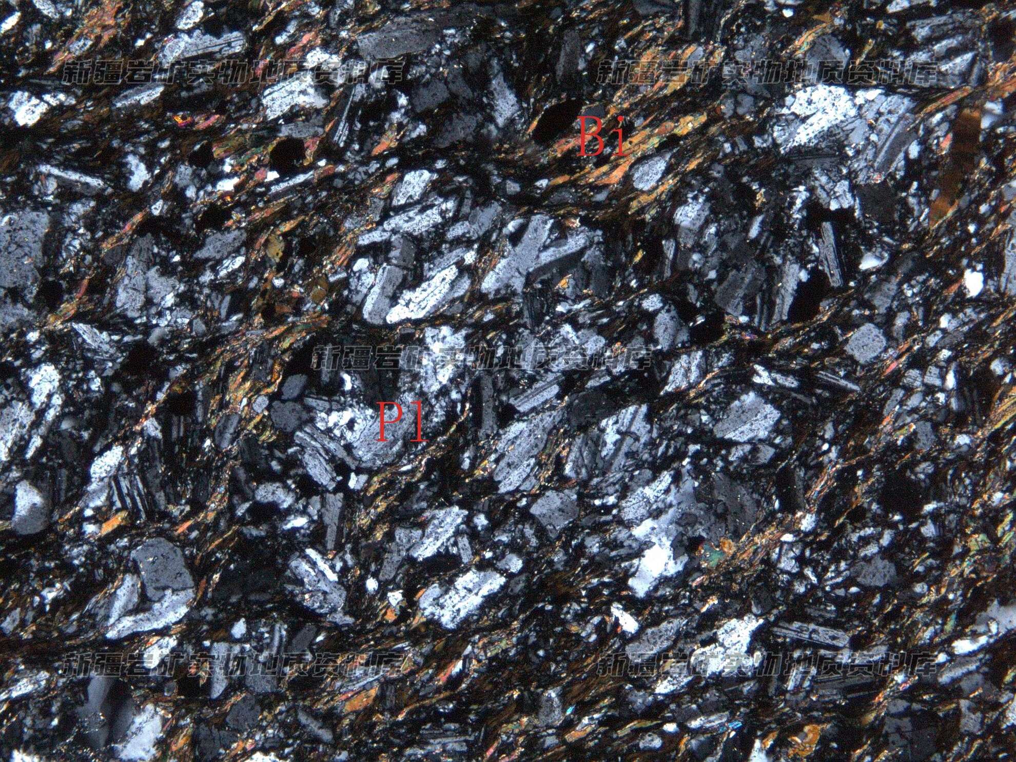 岩石特征描述: 岩石具细粒半自形粒状-板状结构,主要矿物为斜长石(Pl),部分受应力作用影响产生破碎,次生蚀变为黑云母(Bi)化并伴有金属矿物。