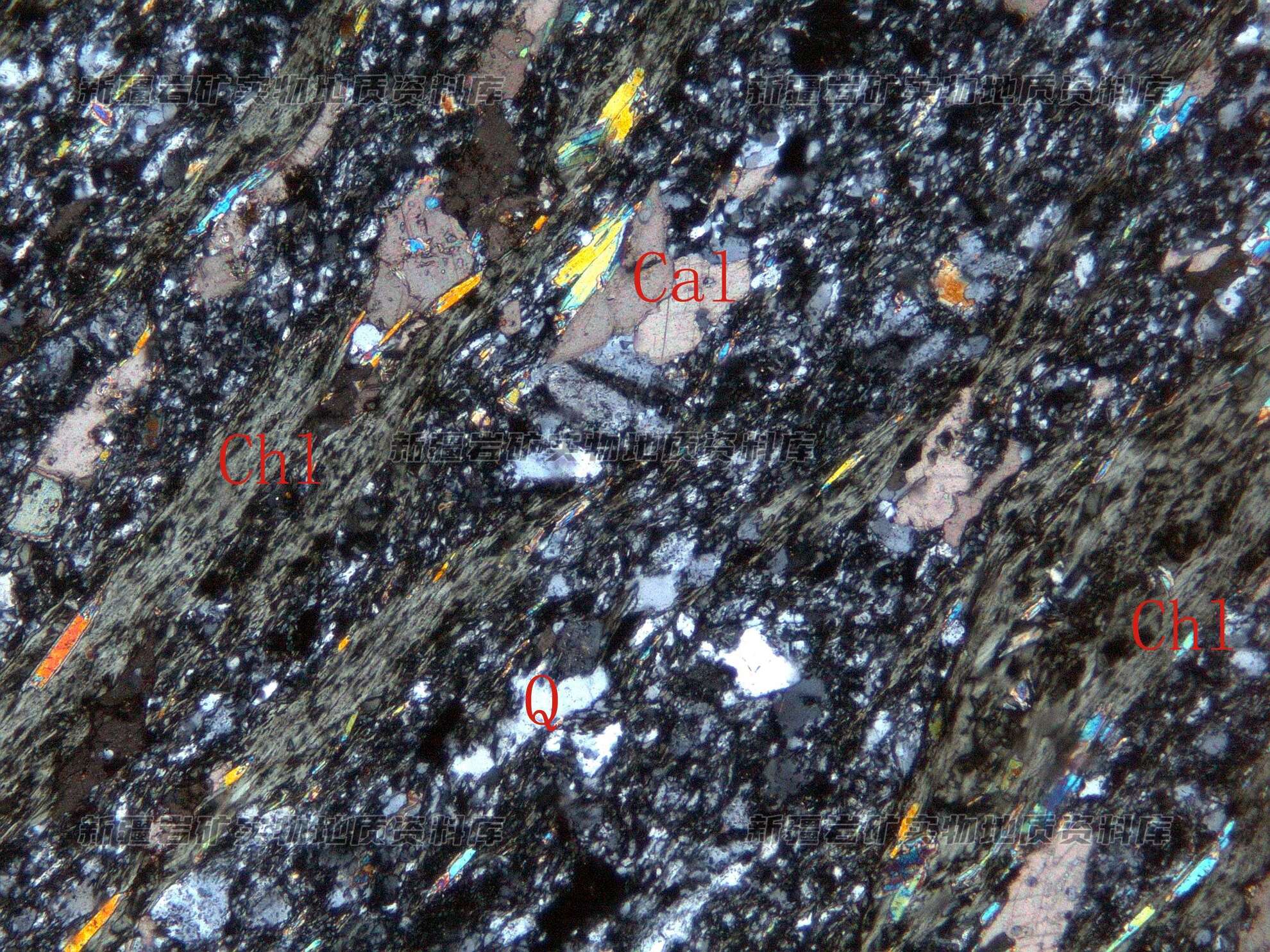 岩石特征描述: 岩石已完全由次生蚀变矿物绿泥石(Chl)方解石(Cal)及石英(Q)集合体构成,可见少量的长石碎片,但成因不明。