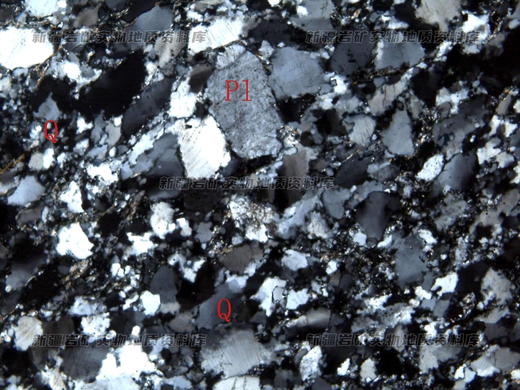 岩石特征描述: 碎屑主要为石英(Q),次有少量的长石(Pl),石英外形呈剧齿状,波状消光,胶结物为细粒石英(Q)及绢云母等。