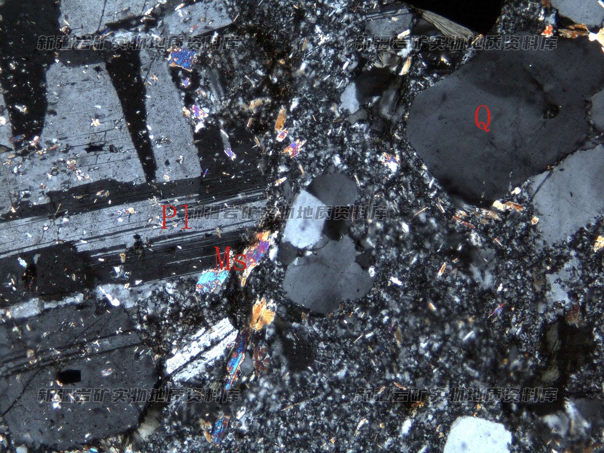 岩石特征描述: 斑晶为斜长石(Pl)和石英(Q),呈半自形粒状-板状分布,基质由细粒长石、石英集合体构成,叠加白云母(Ms)化。