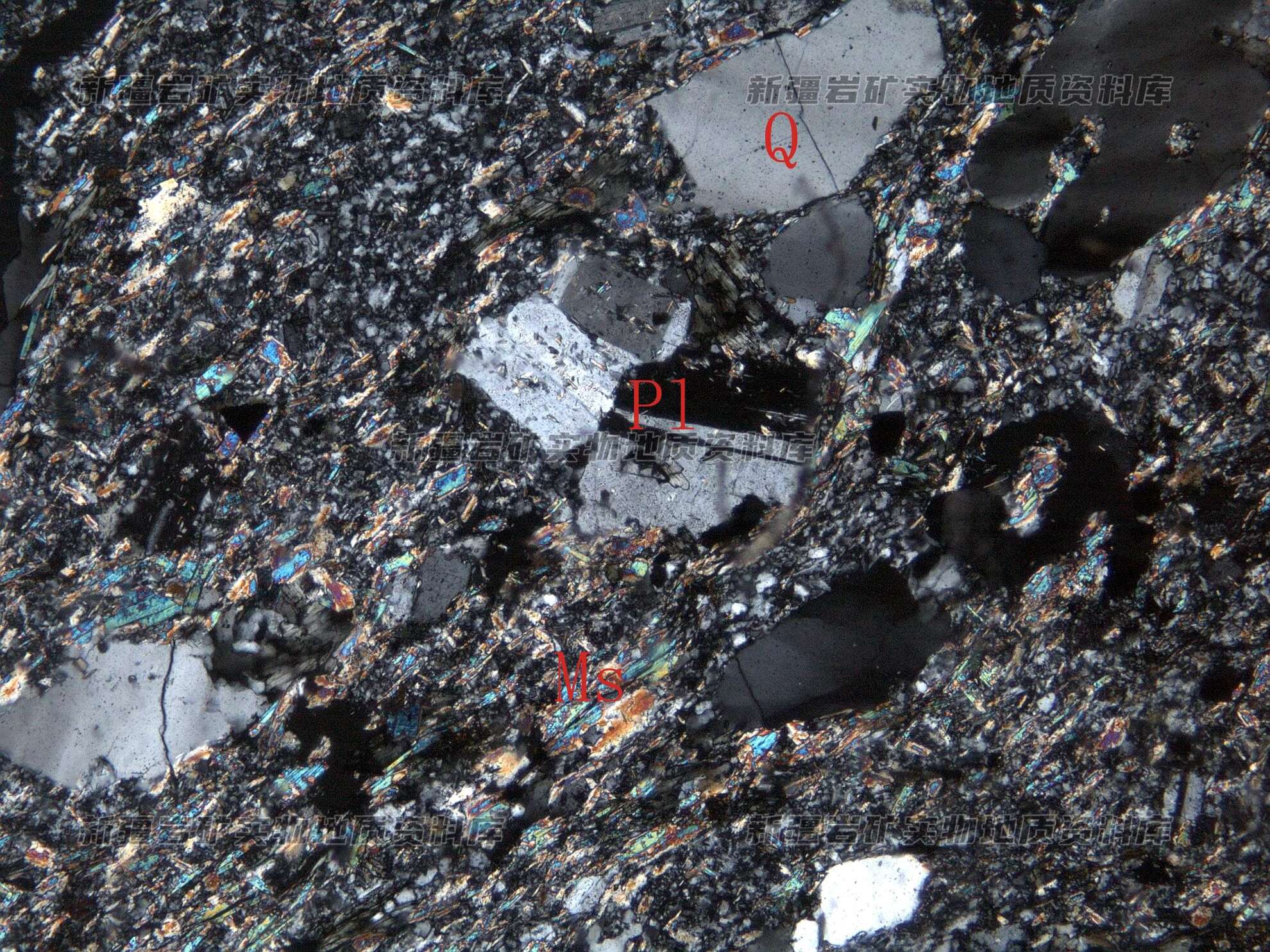 岩石特征描述: 斑晶为斜长石(Pl)和石英(Q),呈半自形粒状-板状分布,基质由细粒长石、石英集合体构成,叠加绢云母化。