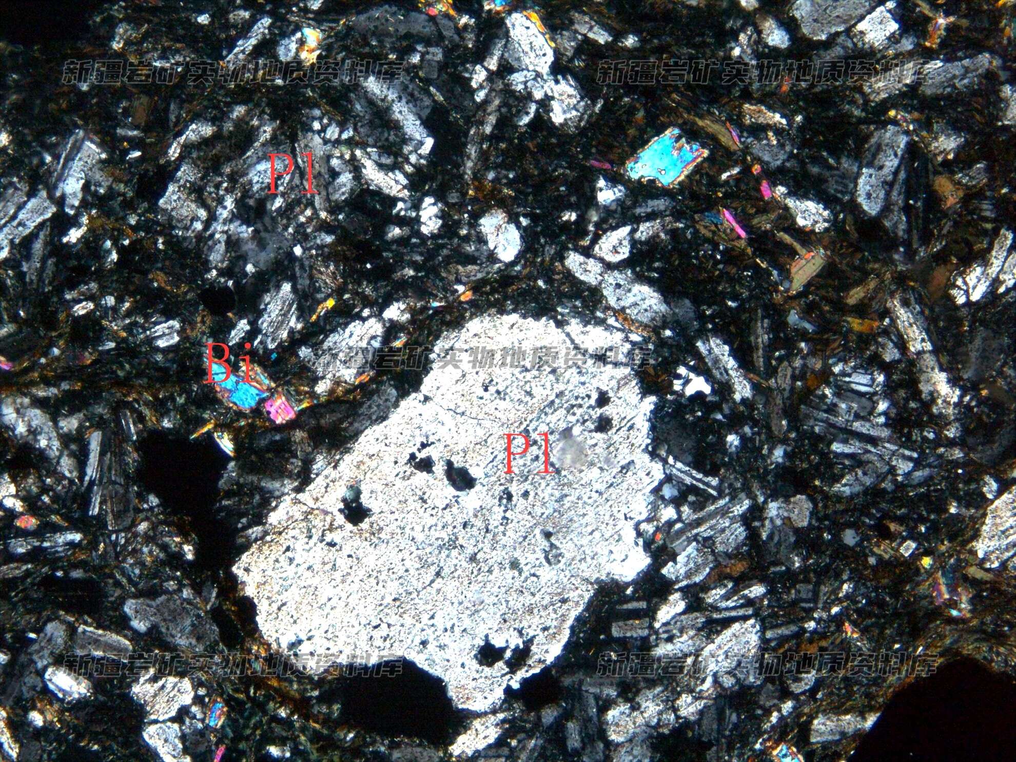 岩石特征描述: 斑晶为斜长石(Pl),呈半自形板状分布,基质由细粒板条状斜长石(Pl)及次生蚀变矿物黑云母(Bi)、绿泥石构成。