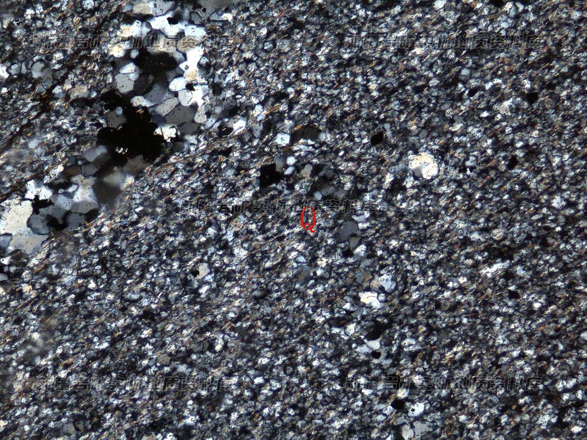 岩石特征描述: 岩石主要由细粒石英(Q)和绢云母集合体构成,绢云母具定向分布,其中含黄铁矿。