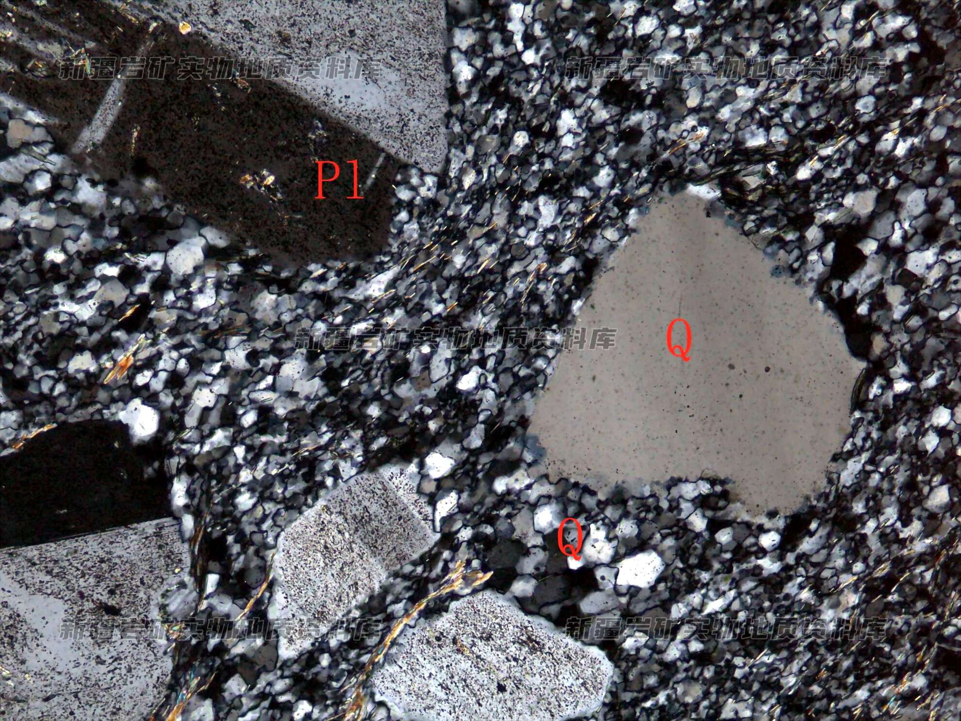 岩石特征描述: 岩石具斑状结构,斑晶为斜长石(Pl)和石英(Q),自形-半自形粒状,基质由细粒长石、石英(Q)集合体构成,并叠加绢云母化。