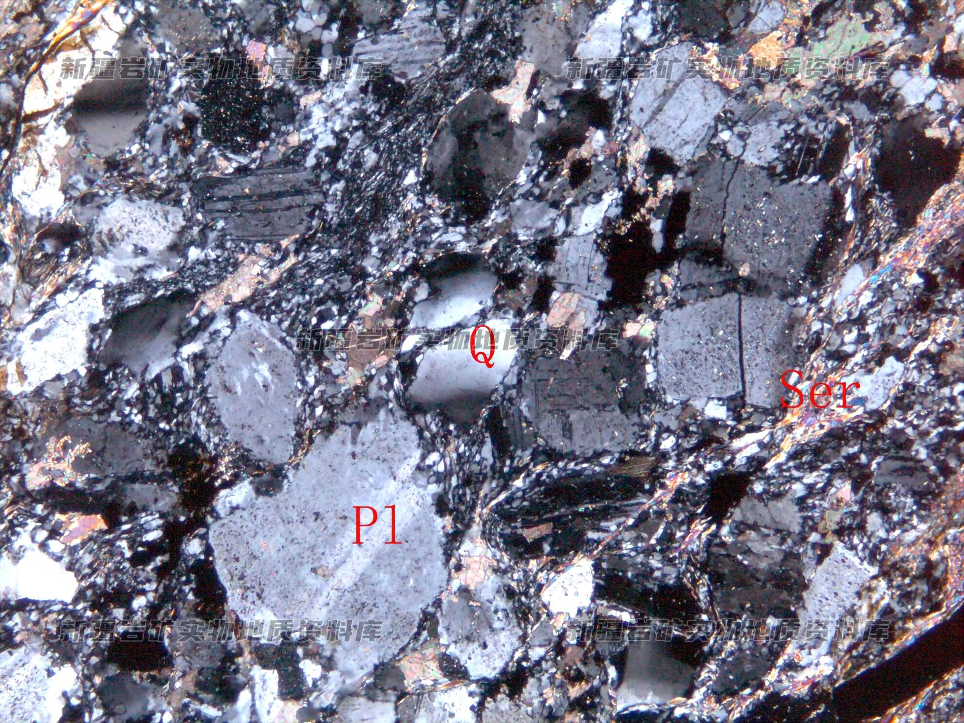 岩石特征描述: 岩石由岩屑和长石(Pl)石英(Q)晶屑及胶结物构成,胶结物为已重结晶的石英和绢云母(Ser)集合体,定向分布。