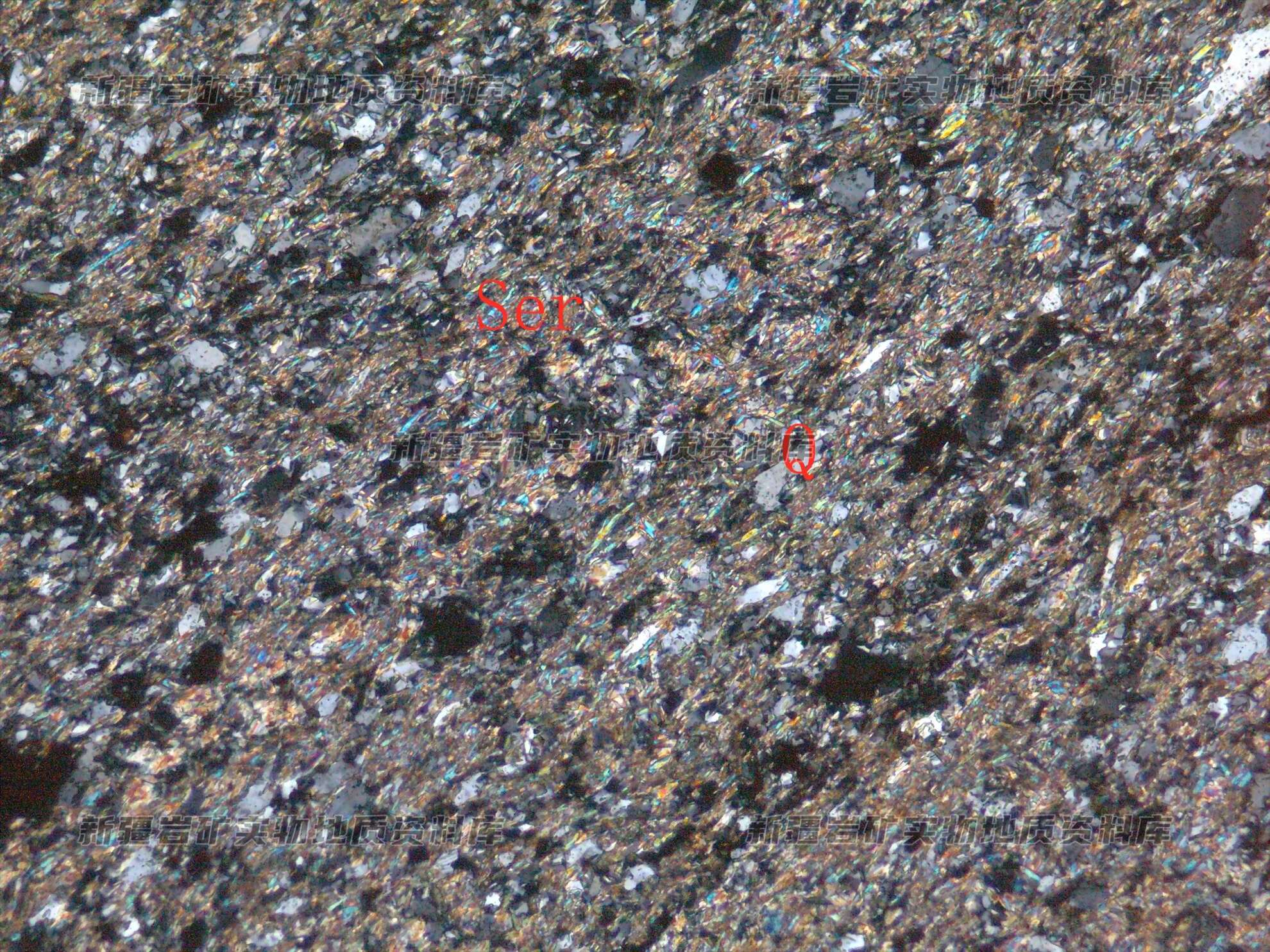 岩石特征描述: 岩石由砂屑、粉砂屑及胶结物构成,粉砂为长石、石英(Q)棱角状、次棱角状,粒径0.004-0.1mm,胶结物为绢云母(Ser),定向分布。