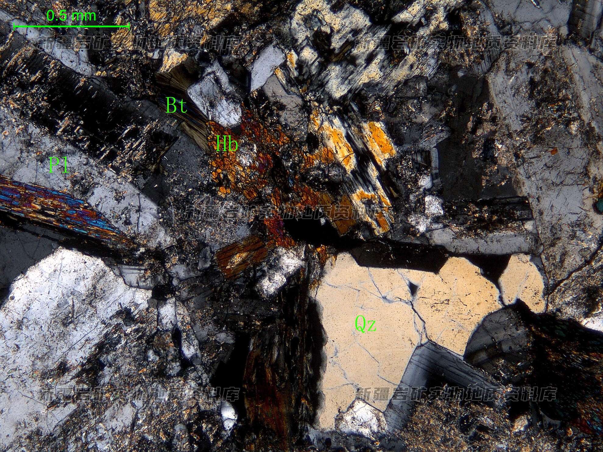 岩石特征描述: 岩石中主要矿物为中长石(Pl)和角闪石(Hb),次为黑云母(Bt)和石英(Qz),见磁铁矿和磷灰石。中长石自形和半自形板状,具环带结构,表面绢云母化和绿帘石化。角闪石半自形柱状,与片状黑云母均分布于长石粒间。石英他形粒状。