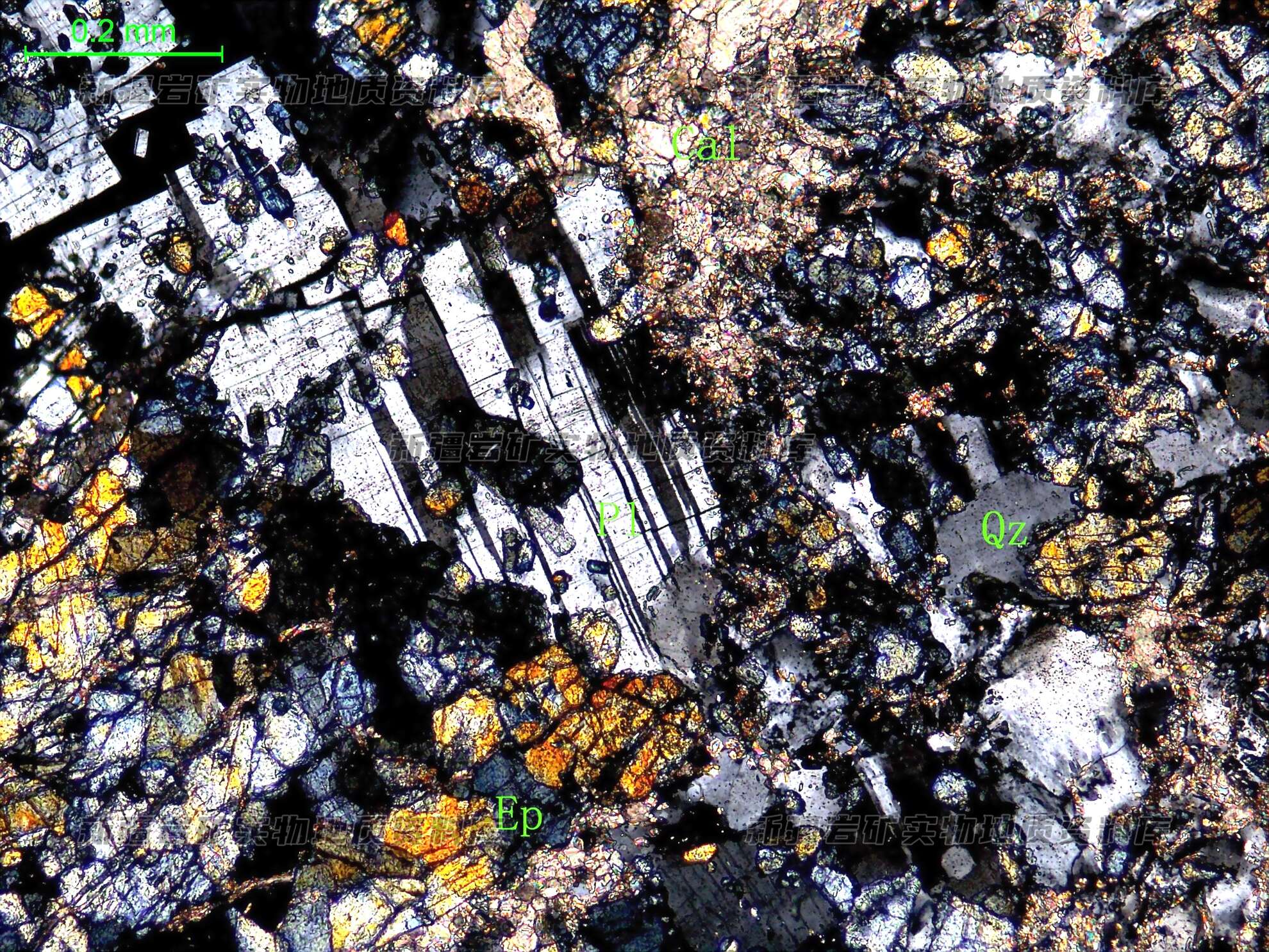 岩石特征描述: 岩石中矿物组成为绿帘石(Ep)、更长石(Pl)、石英(Qz)和方解石(Cal)。绿帘石粒状,在其粒间分布半自形板状的更长石,石英他形粒状,分布于更长石粒间。
