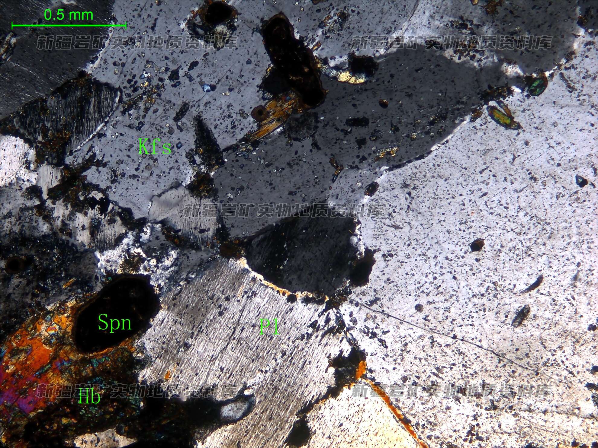 岩石特征描述: 钾长石(Kfs)半自形板状,在钾长石间有半自形板状的更-中长石(Pl),长石表面有次生细粒的绿帘石;在长石间有半自形柱状的角闪石(Hb),角闪石边缘有的被绿帘石交代。