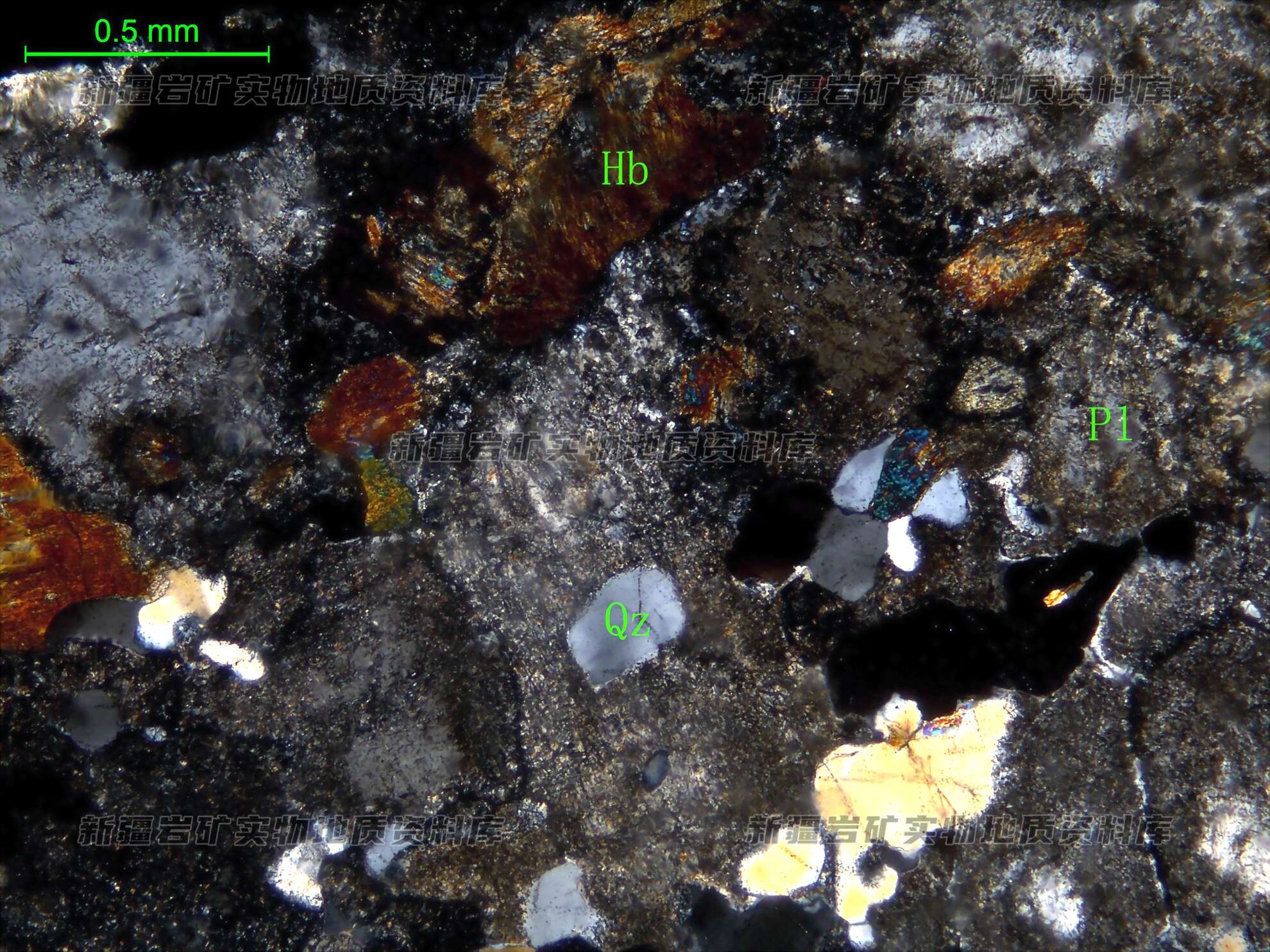 岩石特征描述: 岩石中矿物组成为更-中长石(Pl)、角闪石(Hb)和石英(Qz),见方解石-石英脉。方解石-石英脉分布于岩石裂隙中。更-中长石半自形板状,强蚀变,绢云母化、绿帘石化,部分微呈环带结构;角闪石半自形柱状分布于长石粒间;石英他形粒状,表面多裂纹并波状消光。