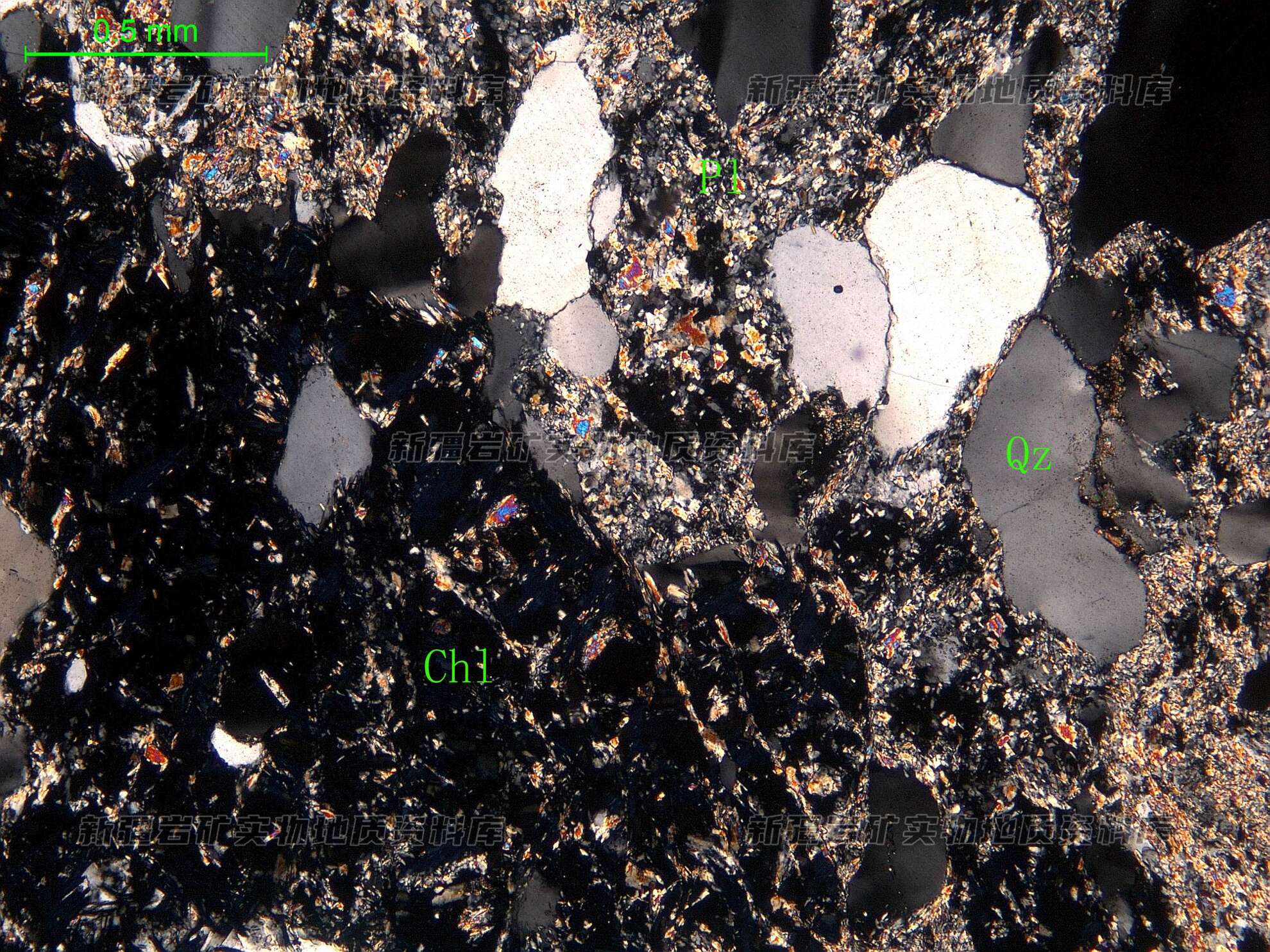 岩石特征描述: 岩石强蚀变。更-中长石(Pl)半自形板状,强绢云母化、绿帘石化;角闪石半自形柱状,现已完全蚀变为绿泥石(Chl);石英(Qz)他形粒状,表面多裂纹,波状消光。