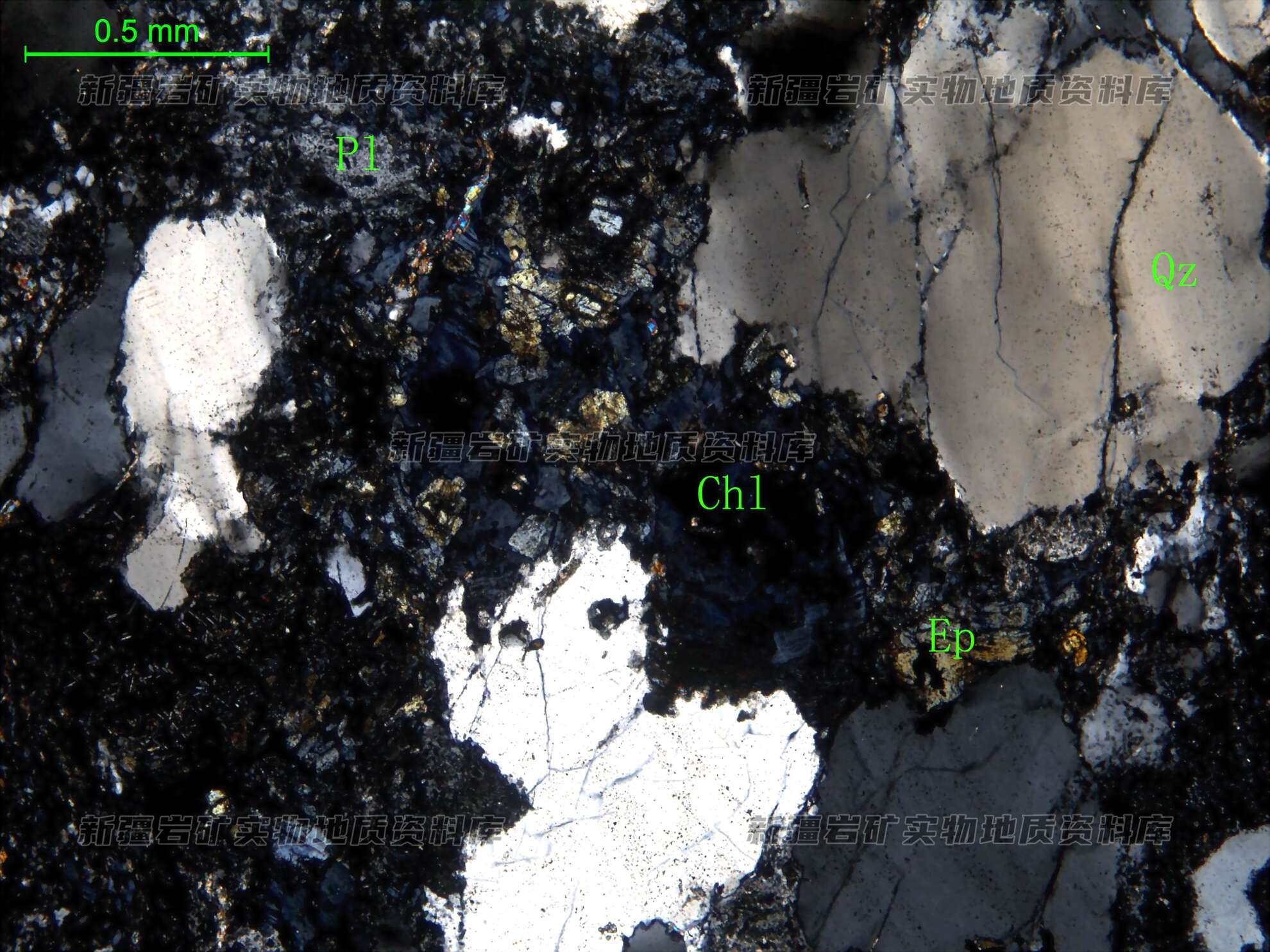 岩石特征描述: 更长石(Pl)半自形板状,表面绢云母化;在更长石粒间分布的暗色矿物已完全被绿泥石(Chl)和绿帘石(Ep)集合体所取代,推断原暗色矿物为角闪石;石英(Qz)他形粒状,分布于长石粒间,表面多裂纹并波状消光。