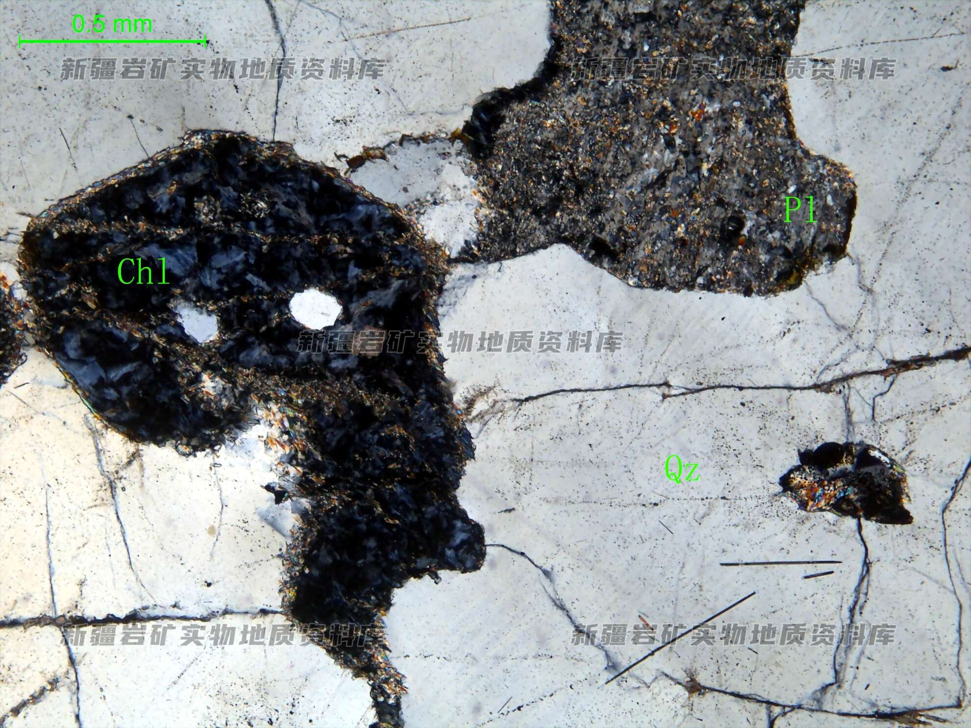岩石特征描述: 岩石中石英(Qz)占主导,构成基本格架,在半自形粒状的石英颗粒中包裹有半自形板状的更长石(Pl),其表面绢云母化;同时在石英颗粒中包裹有片状的绿泥石(Chl)集合体。