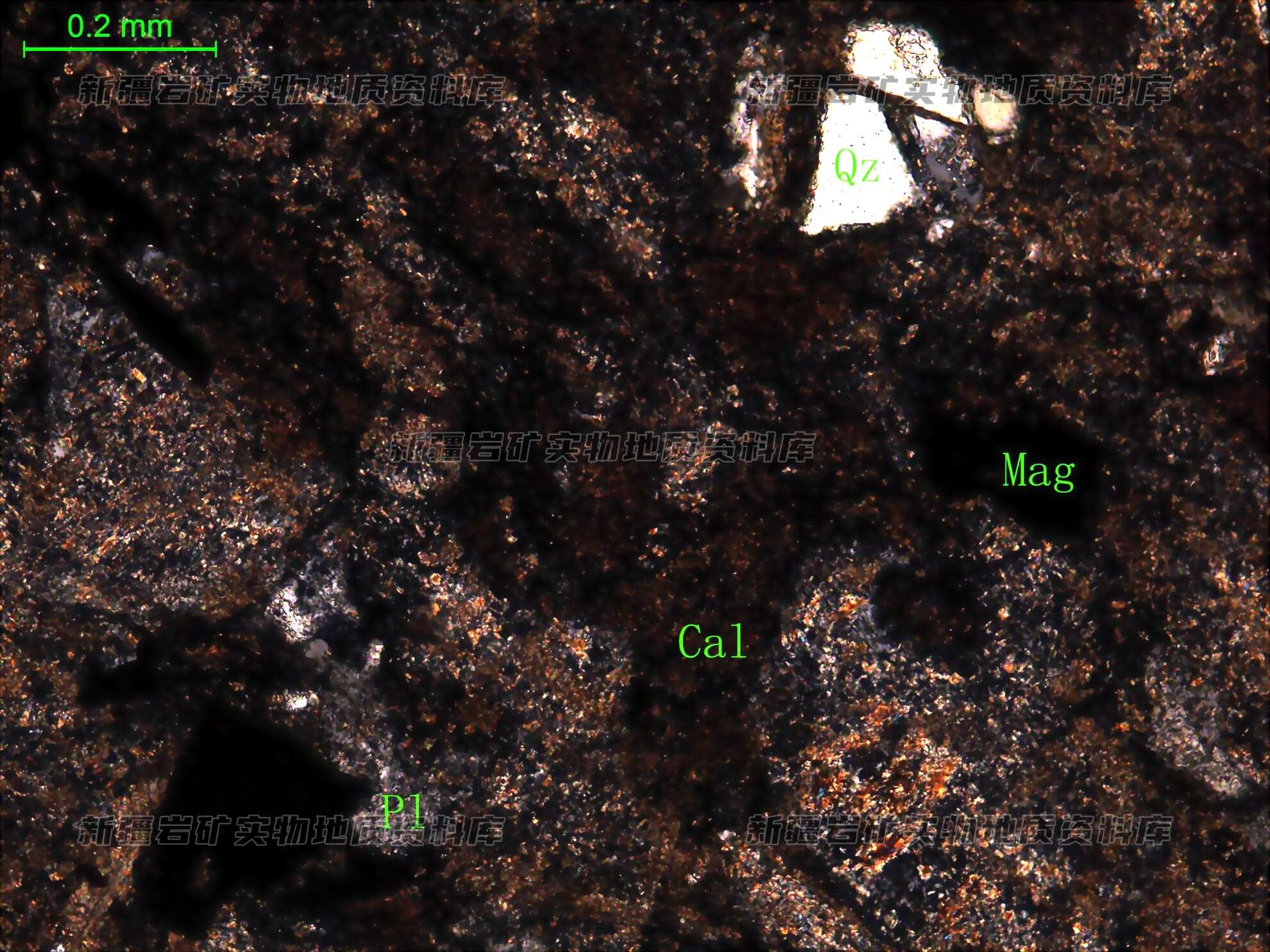 岩石特征描述: 岩石中主要矿物为中长石(Pl)和角闪石,次为磁铁矿(Mag)和石英(Qz)。中长石半自形板状,强蚀变,绢云母化、绿帘石化;角闪石多被方解石、绿泥石集合体交代,保留其外形;磁铁矿半自形粒状,分布于角闪石之间;石英他形粒状。