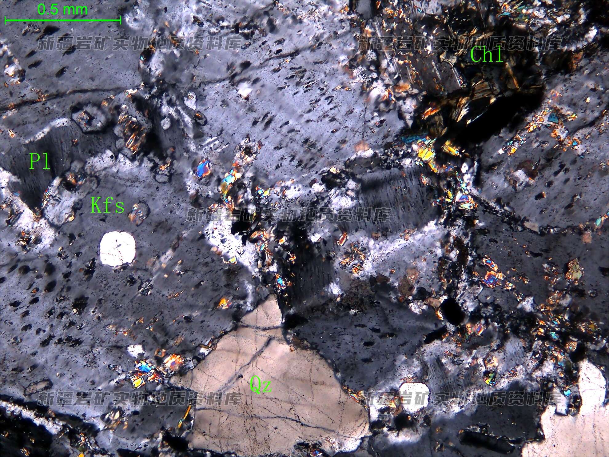 岩石特征描述: 更-中长石(Pl)半自形板状,表面绢云母化、绿帘石化;钾长石(Kfs)半自形板状,分布于斜长石粒间并交代斜长石;石英(Qz)半自形粒状,分布于长石粒间;绿泥石(Chl)片状,交代角闪石。