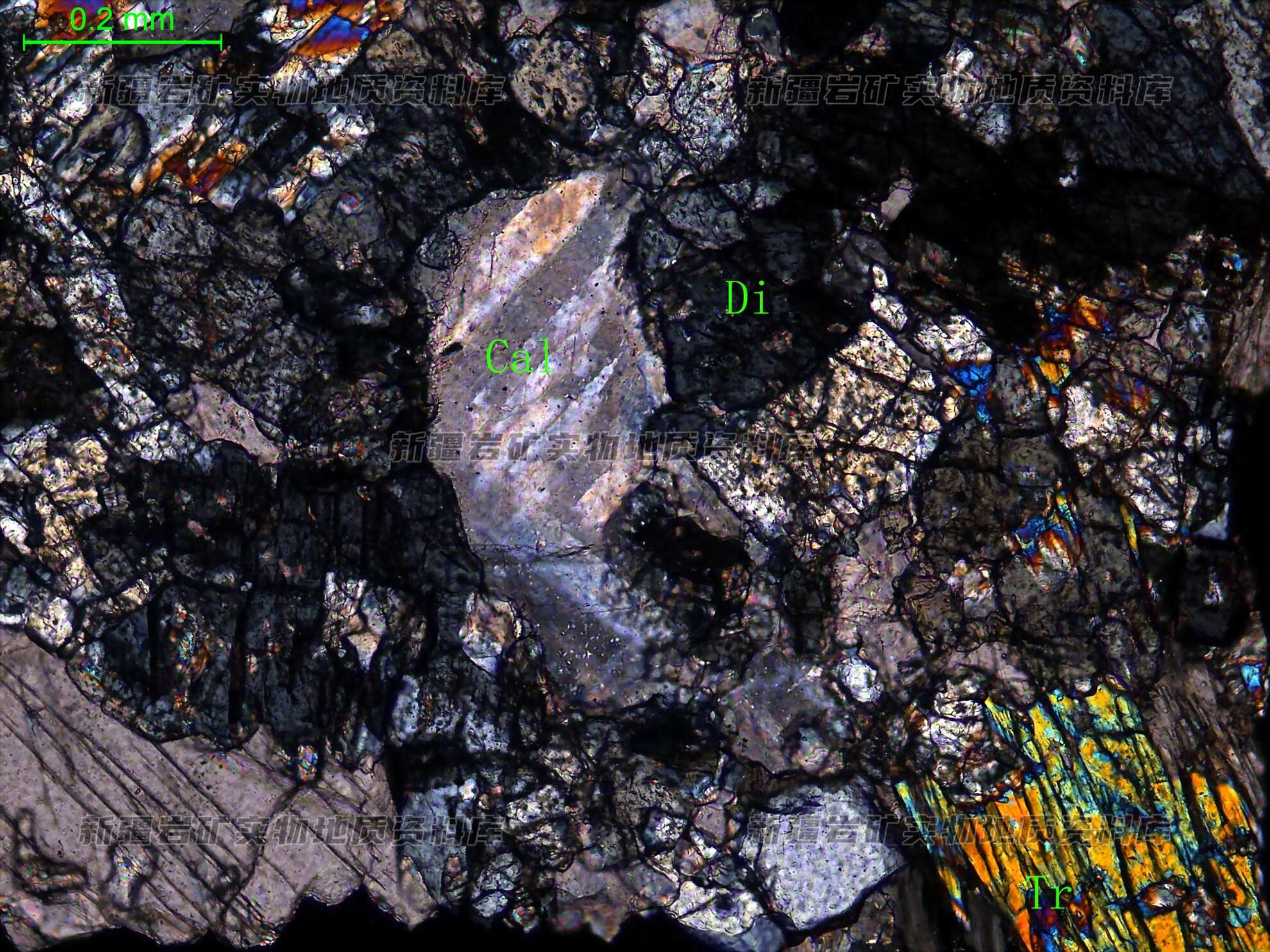岩石特征描述: 透辉石(Di)半自形柱状,边缘被透闪石(Tr)交代;在透辉石粒间有粒状变晶的方解石(Cal)。