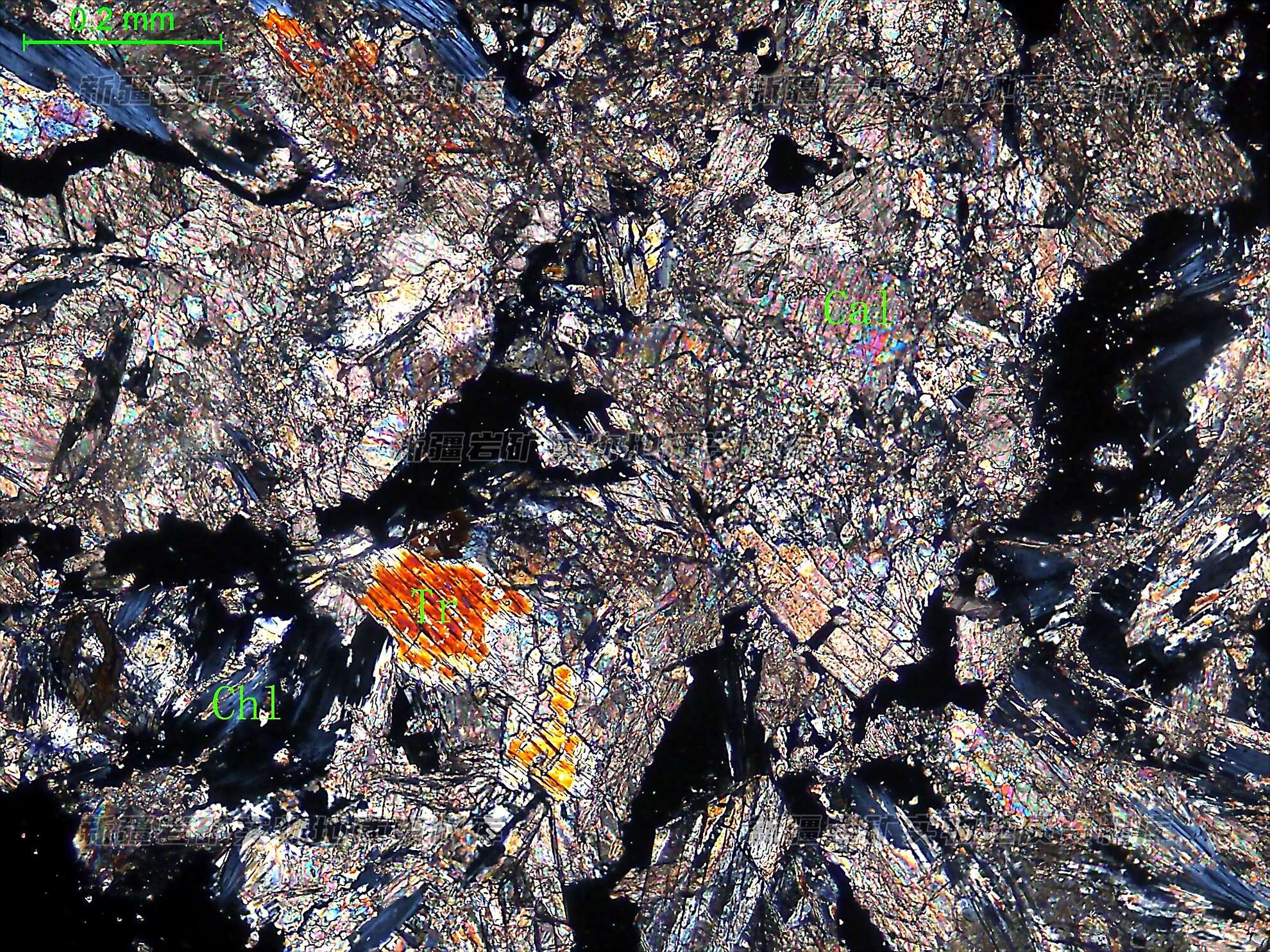 岩石特征描述: 岩石矿物成分单一,主要为方解石(Cal)、透闪石(Tr),见绿泥石(Chl)。方解石呈集合体状分布,在方解石集合体中分布纤柱状的透闪石,透闪石部分被绿泥石交代。