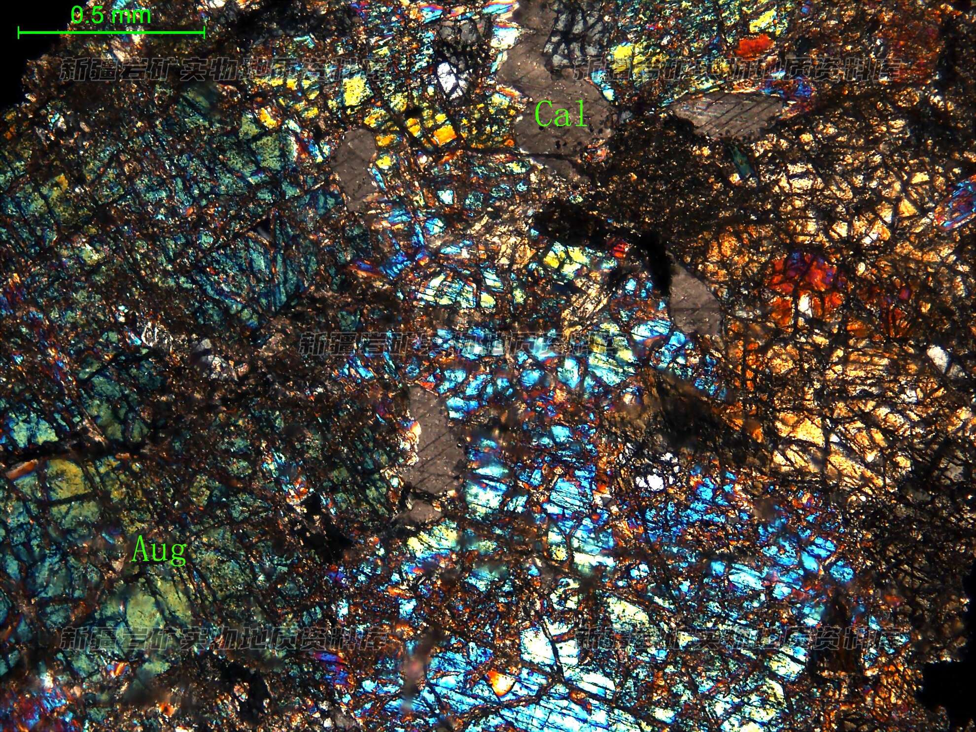 岩石特征描述: 岩石中主要矿物为普通辉石(Aug),见方解石(Cal)和透闪石。普通辉石半自形柱状,杂乱分布;在普通辉石粒间分布半自形粒状的方解石,部分沿辉石裂隙分布。