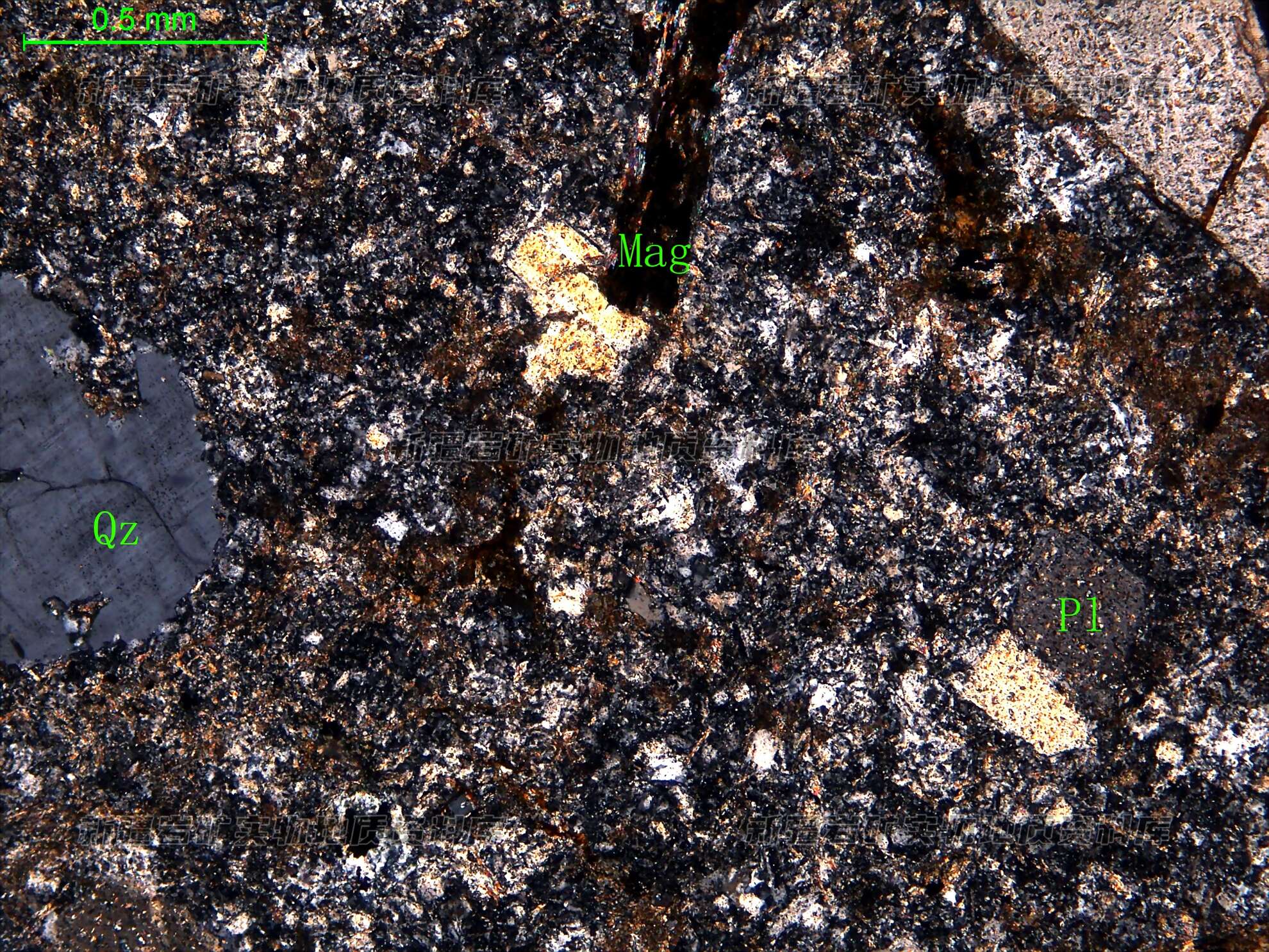 岩石斑晶有自形和半自形板状的更长石,在更长石表面有次生绢云母;斑晶还有半自形粒状的石英,石英具有熔蚀的外形;斑晶还有片状白云母,在白云母中包有半自形粒状的磁铁矿。