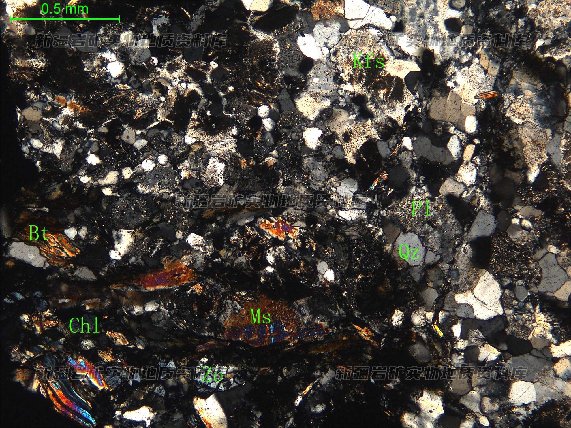 岩石特征描述: 岩石中主要矿物为钾长石(Kfs)、斜长石(Pl)和石英(Qz),次为黑云母(Bt)和白云母(Ms),见黝帘石(Zo)。钾长石半自形板状,形成似眼球状,分布于片麻理间;斜长石半自形板状,表面多黝帘石化;石英他形粒状,定向分布;黑云母、白云母均为片状,沿着片麻理微呈定向分布,其中部分黑云母被绿泥石交代。