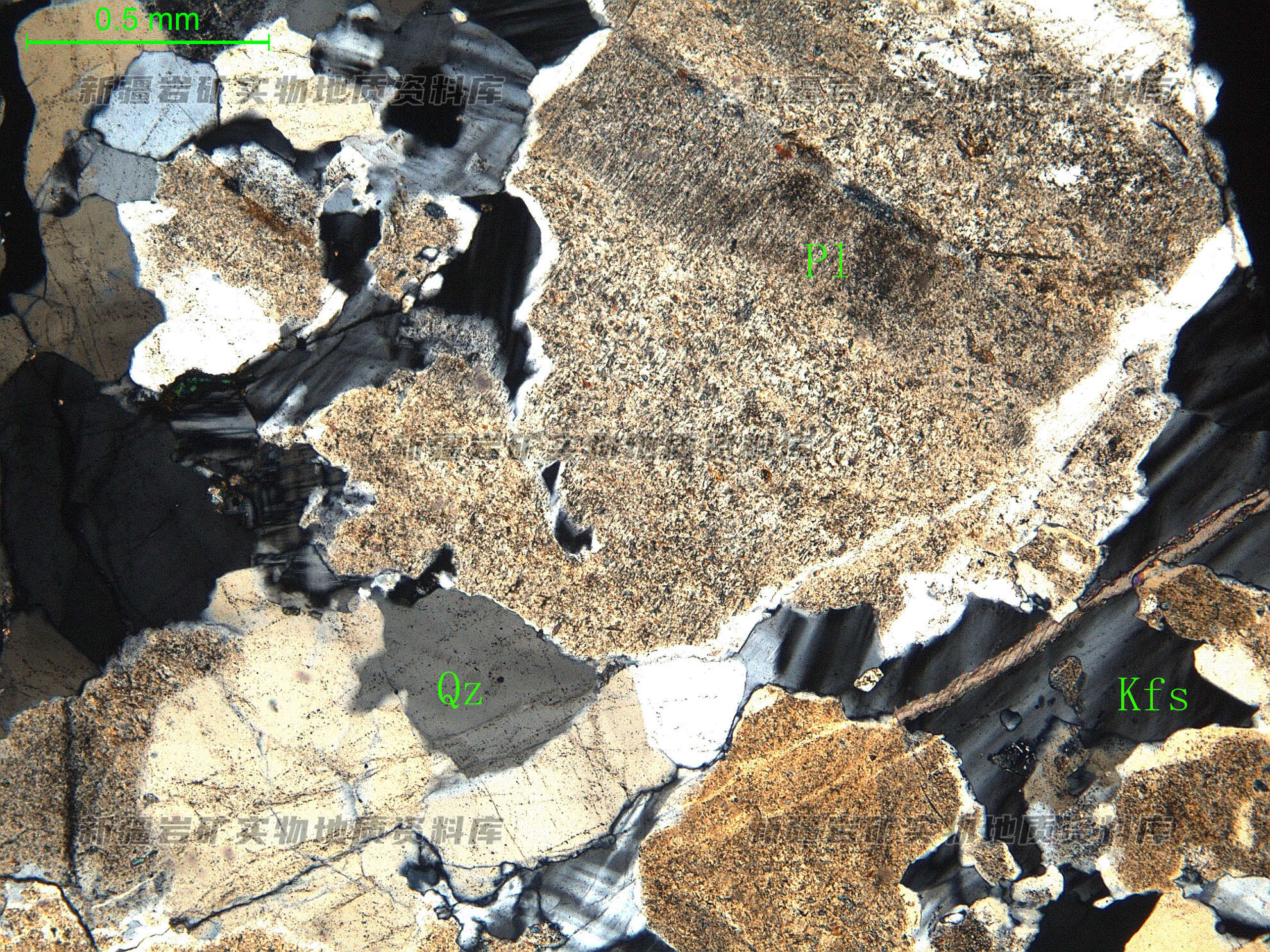 岩石特征描述: 岩石中主要矿物为更-中长石(Pl)、钾长石(Kfs)和石英(Qz),见白云母和绿帘石。更-中长石半自形板状,表面绢云母化、绿帘石化;钾长石半自形板状,分布于更-中长石之间并交代更-中长石;石英他形粒状,表面多裂纹,波状消光。