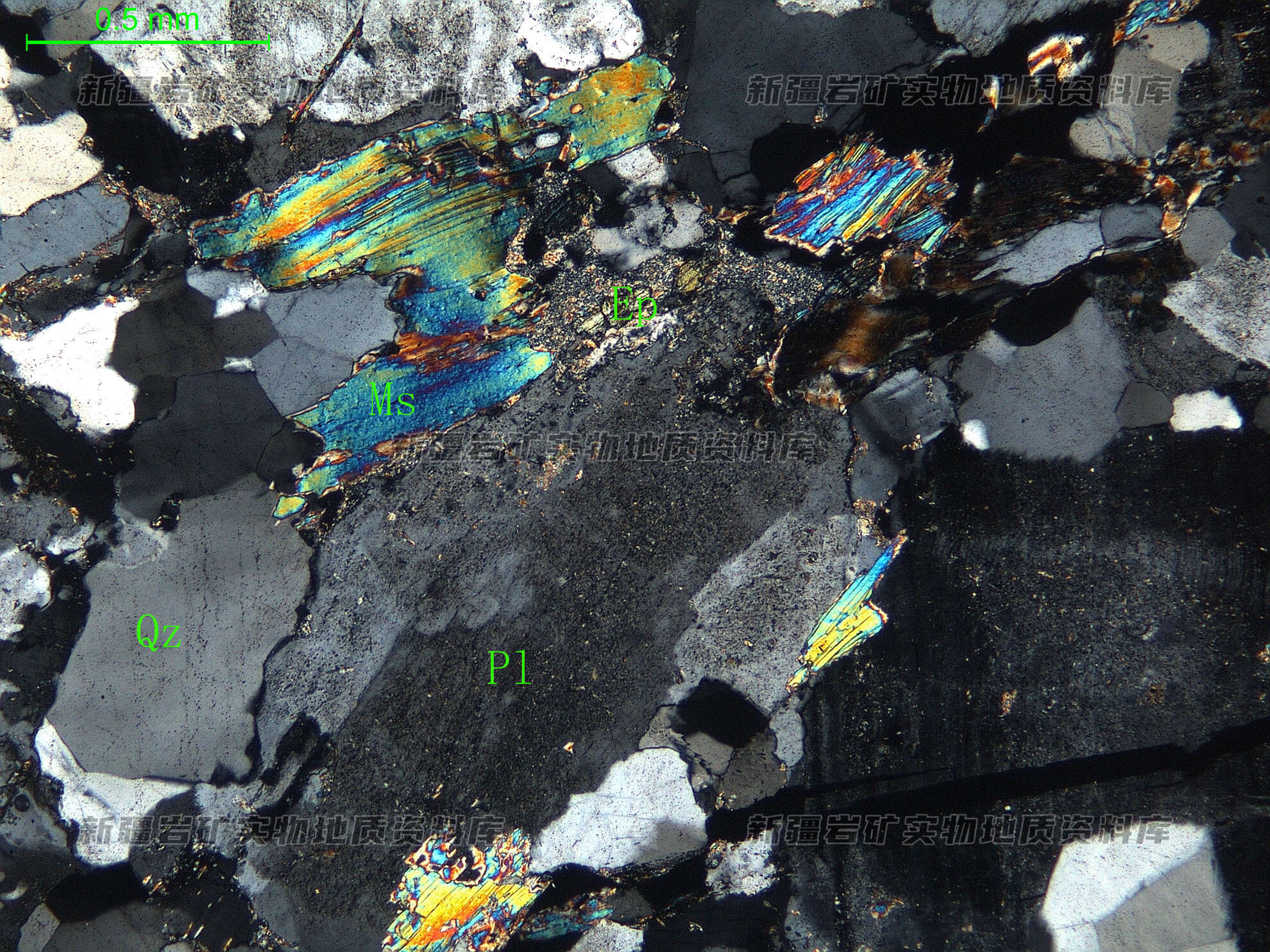 岩石特征描述: 更-中长石(Pl)半自形板状,表面绢云母化、绿帘石化,微显环带结构;在更-中长石间分布片状白云母(Ms),白云母显定向分布,显片麻状构造。石英(Qz)他形粒状,受构造挤压表面多裂纹,并波状消光。